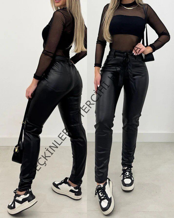 Kadın Yüksek Bel Kuşaklı Deri Pantolon