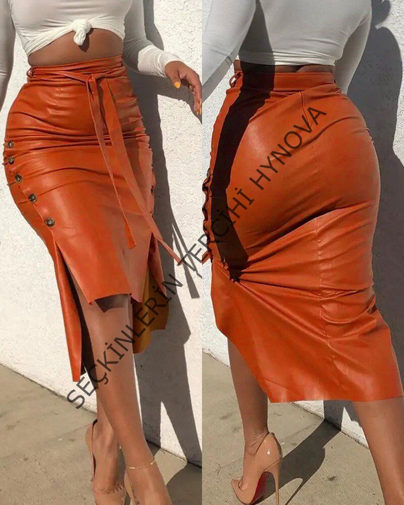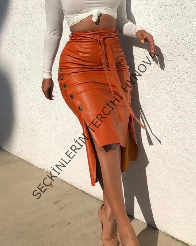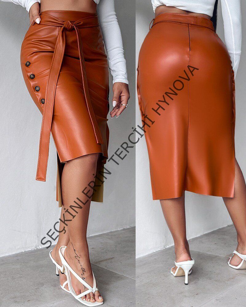 Kadın Yüksek Bel Kuşaklı Yanlardan Düğmeli Mini Deri Etek