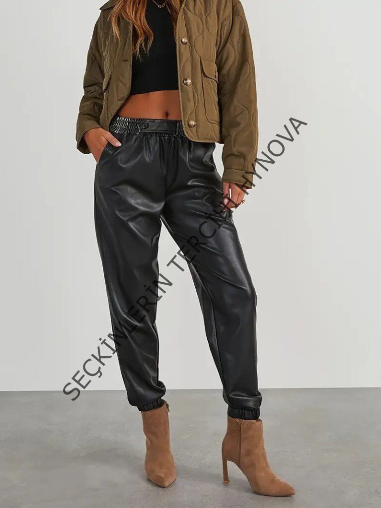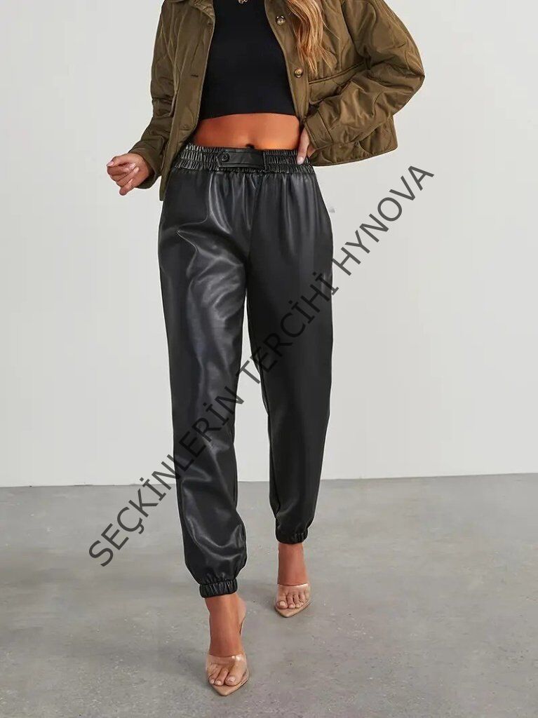 Kadın Yüksek Bel Lastikli önü Düğmeli Deri Pantolon