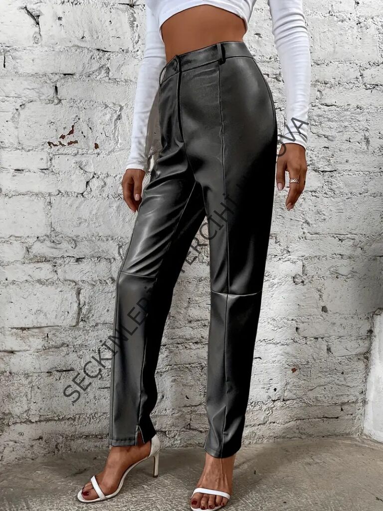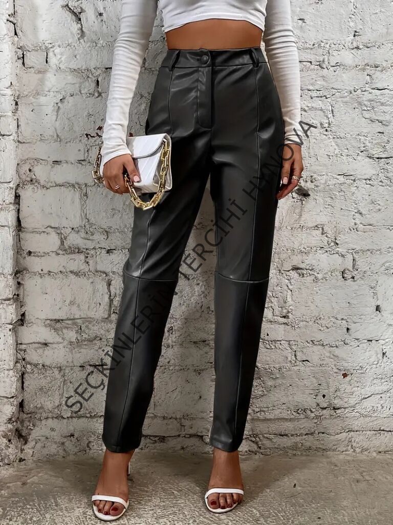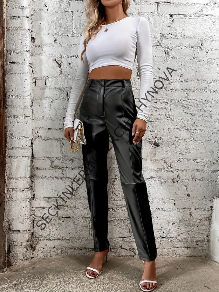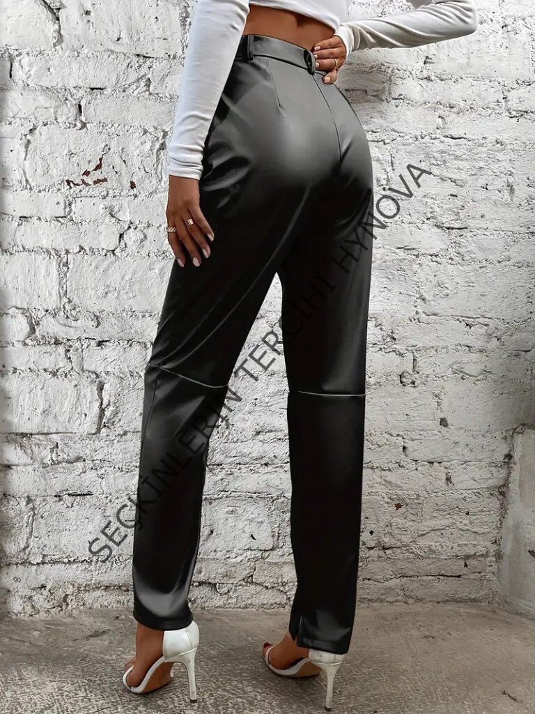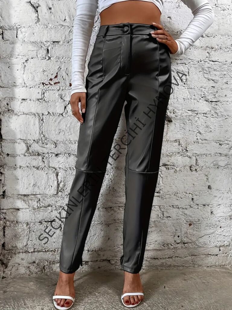 Kadın Yüksek Bel önden Düğmeli Deri Pantolon