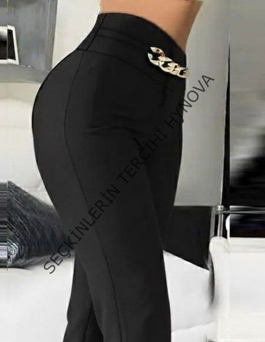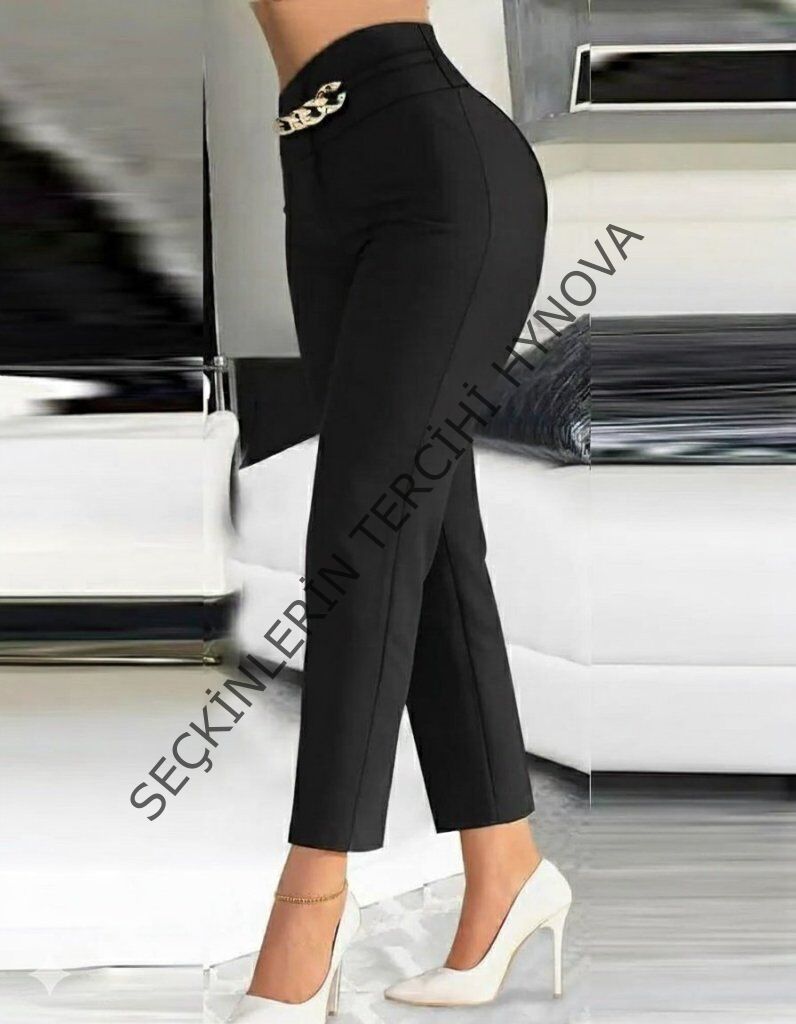Kadın Yüksek Bel önden Zincir Detaylı Ithal Krep Pantolon