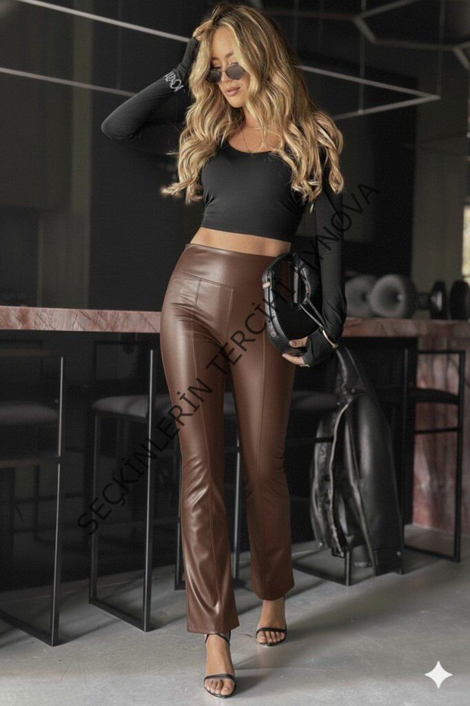 Kadın Yüksek Bel Paçaya Doğru Geniş Deri Pantolon