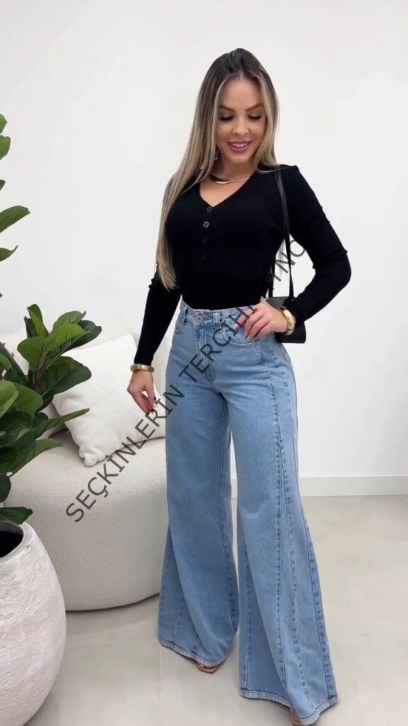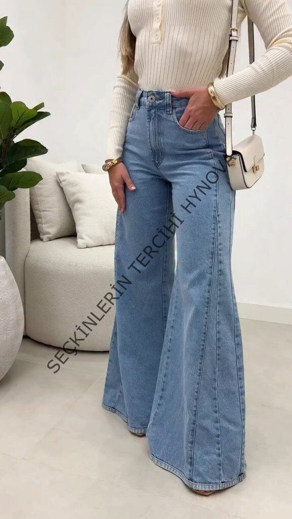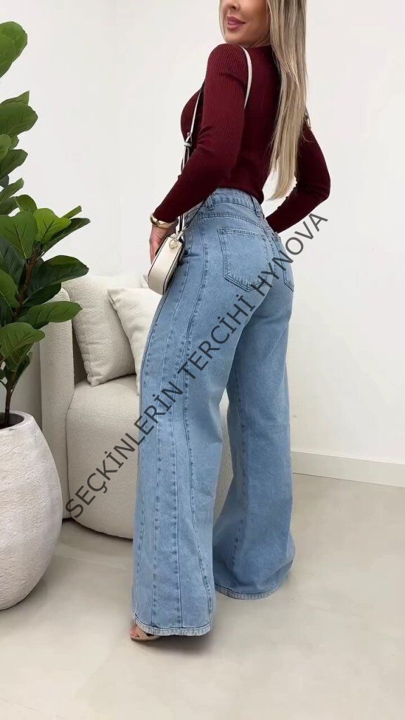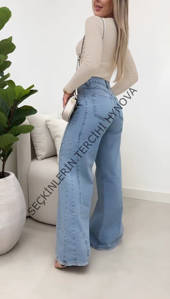 Kadın Yüksek Bel Paçaya Doğru Geniş Kesimli Kot Pantolon
