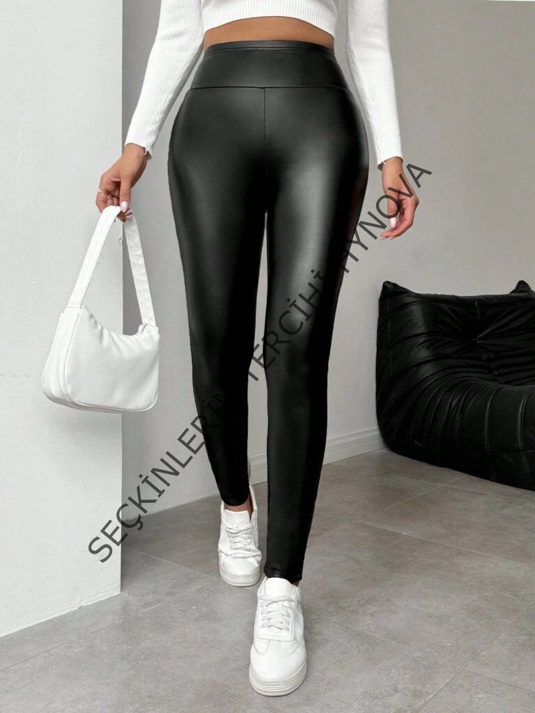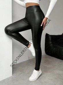 Kadın Yüksek Bel şardonlu Parlak Deri Tayt