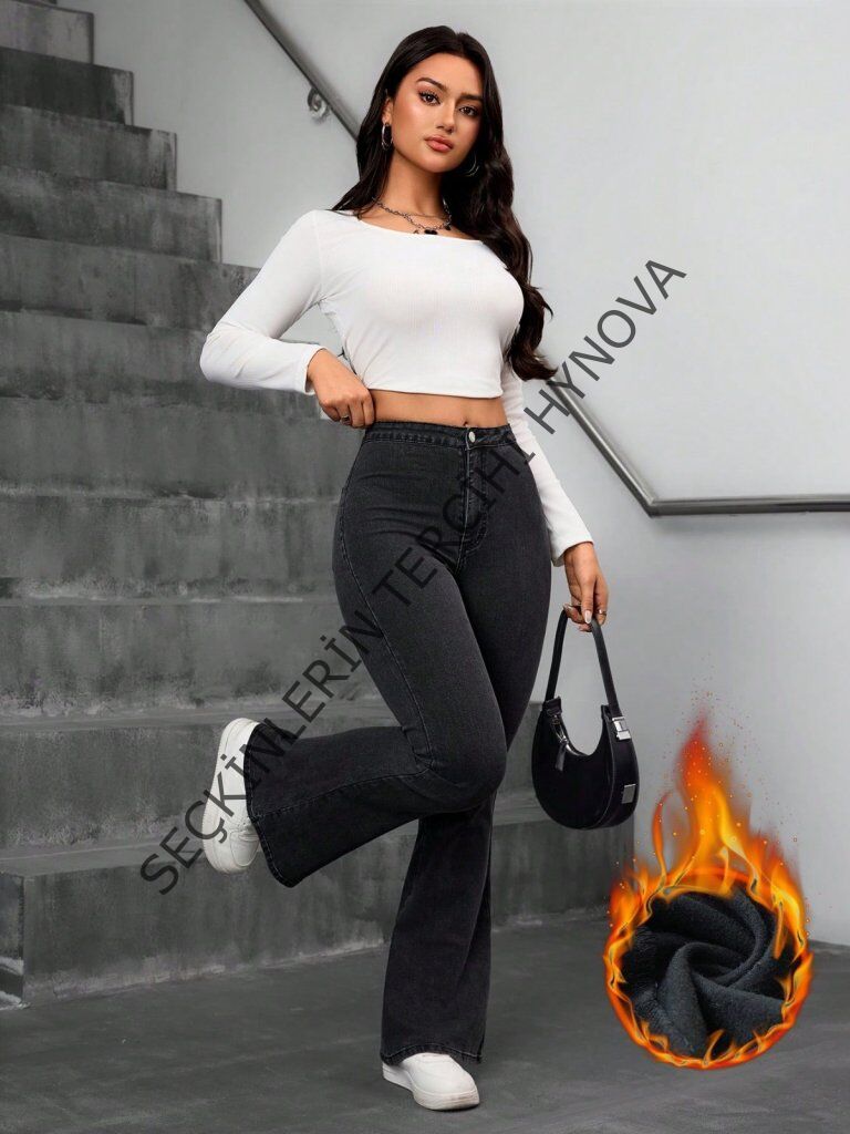Kadın Yüksek Bel Tek Düğmeli Paçaya Doğru Genişleyen Kot Pantolon