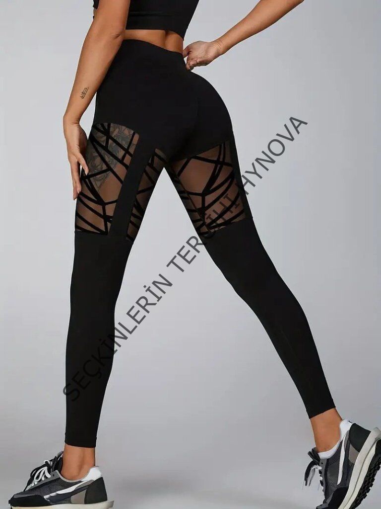Kadın Yüksek Bel Tül Detaylı Spor Tayt