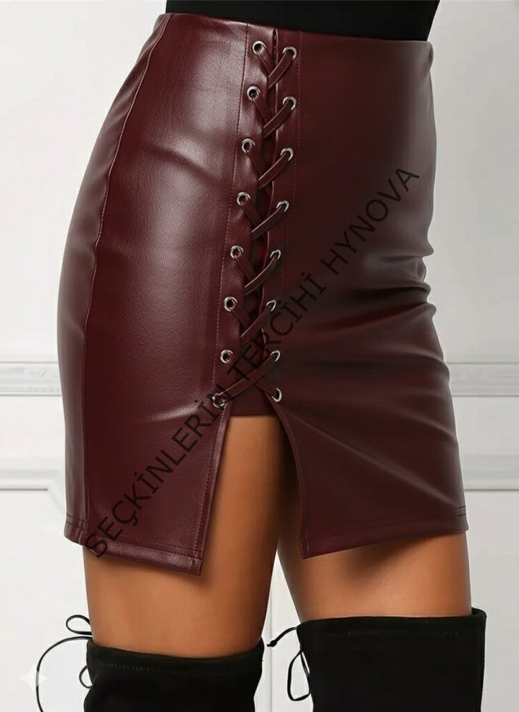 Kadın Yüksek Bel Yandan çapraz Bağcıklı Yırtmaçlı Mini Deri Etek