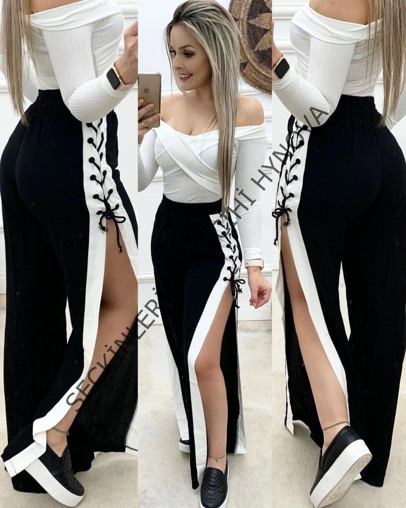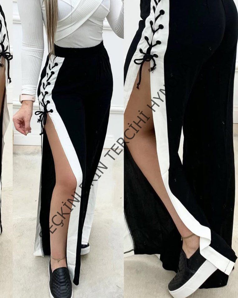 Kadın Yüksek Bel Yandan çapraz Bağcıklı Yırtmaçlı Viskon Iki Iplik Pantolon