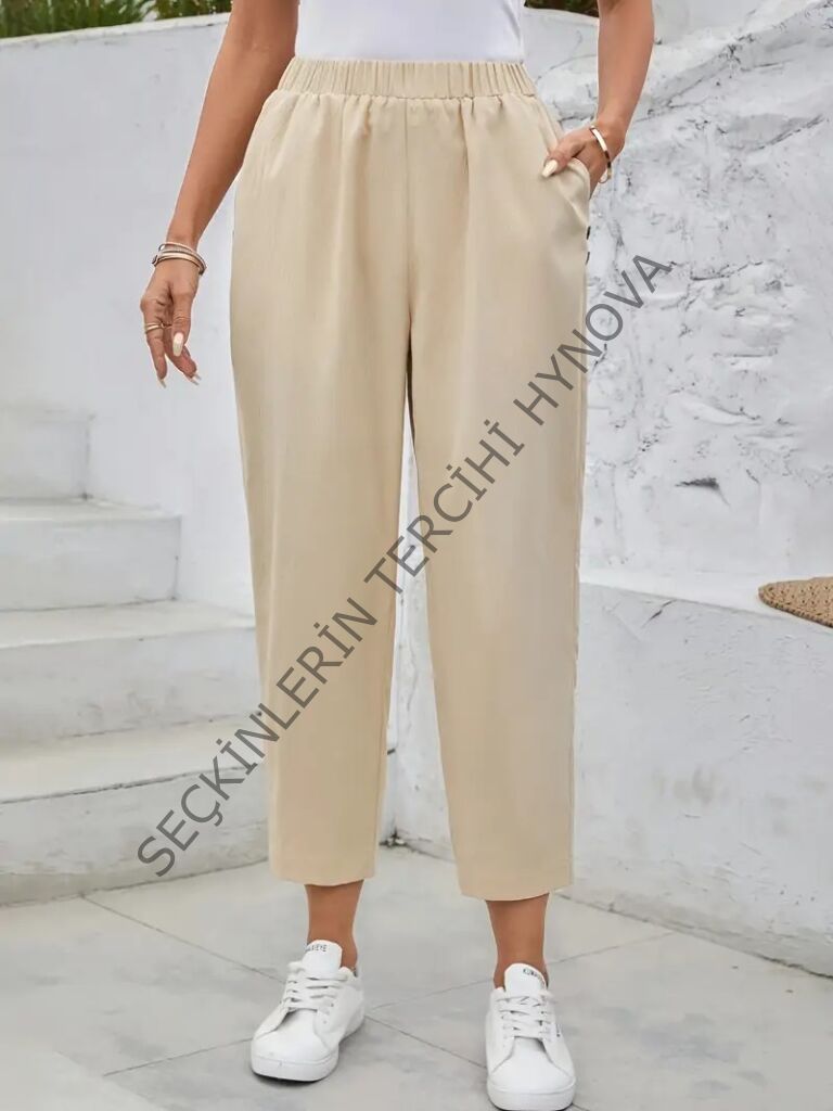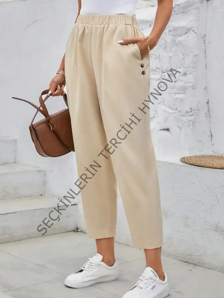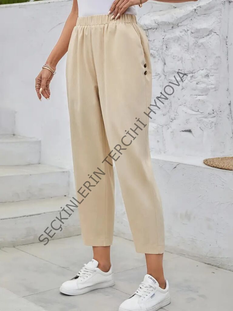 Kadın Yüksek Bel Yandan Cepli Düğme Detaylı Geniş Kesim Ithal Krep Pantolon