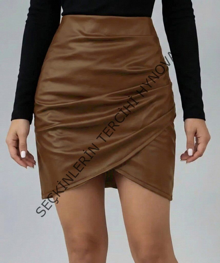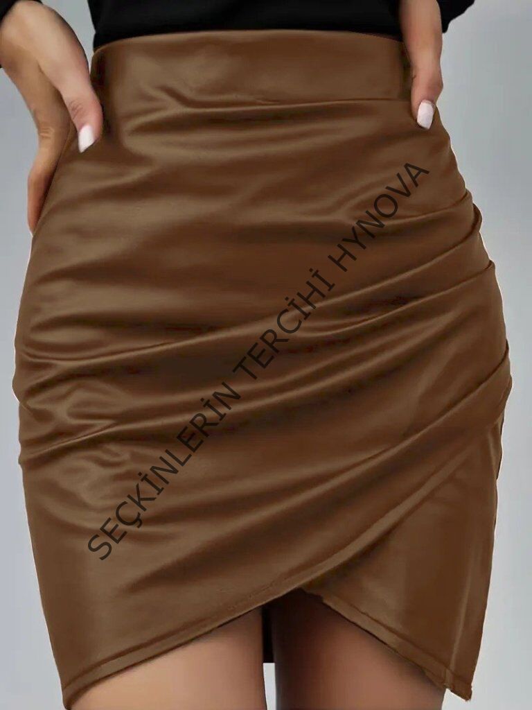 Kadın Yüksek Bel Yandan Fermuarlı Pileli Mini Deri Etek
