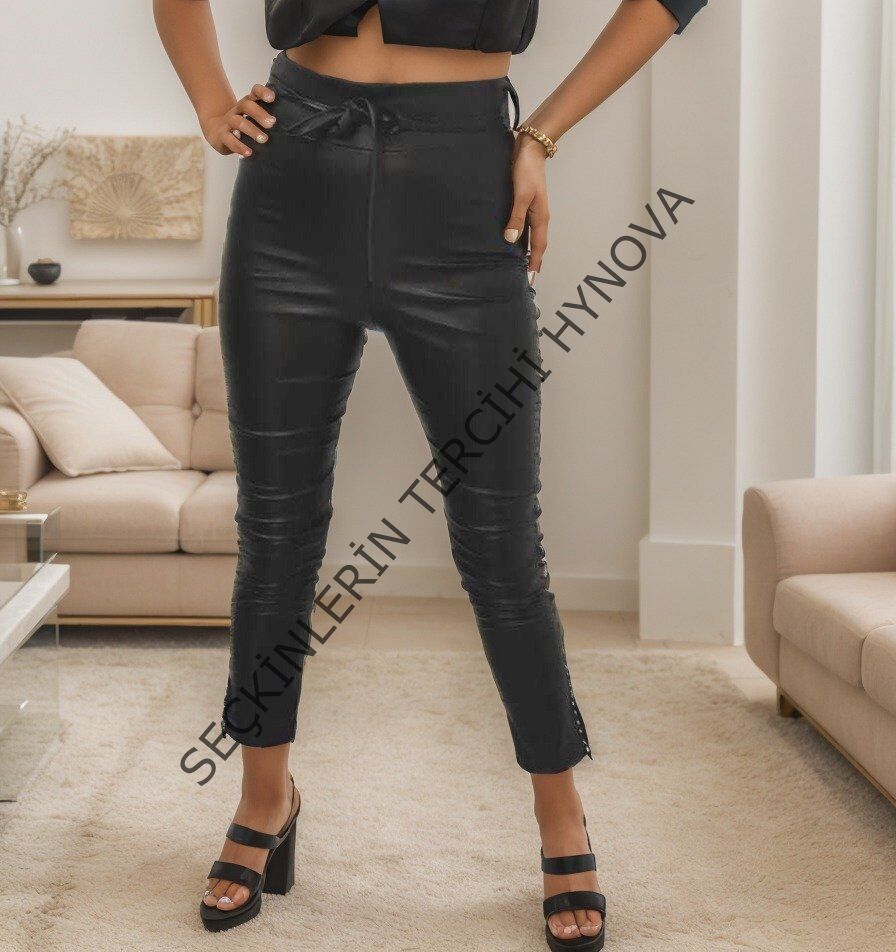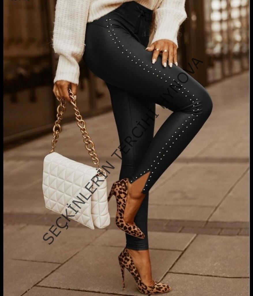 Kadın Yüksek Bel Yanlardan Incili Yırtmaçlı Uzun Deri Tayt