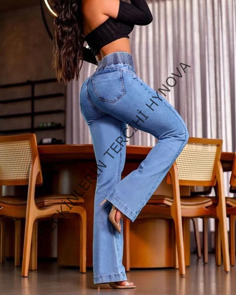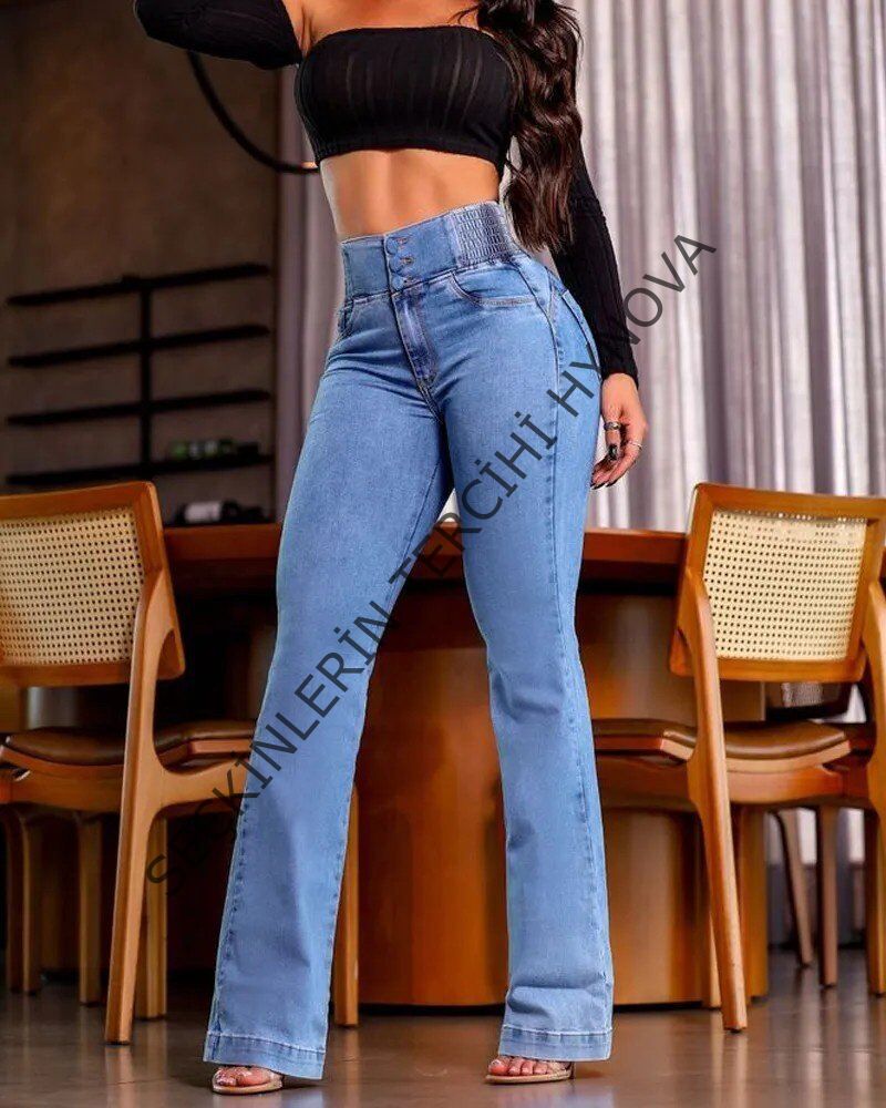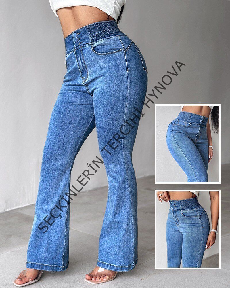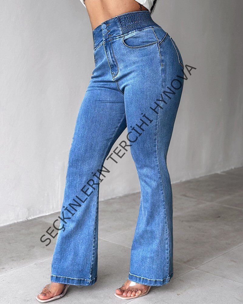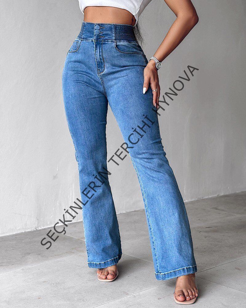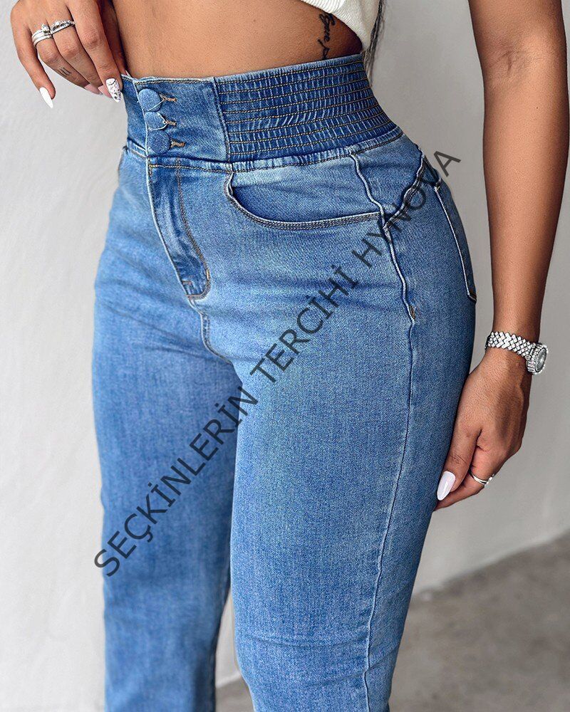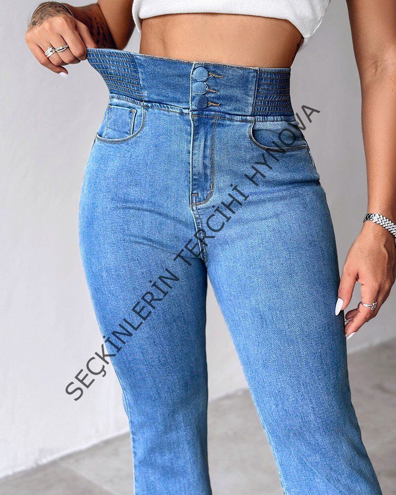 Kadın Yüksek Bel Yanları Lastik önü Düğmeli Kot Pantolon