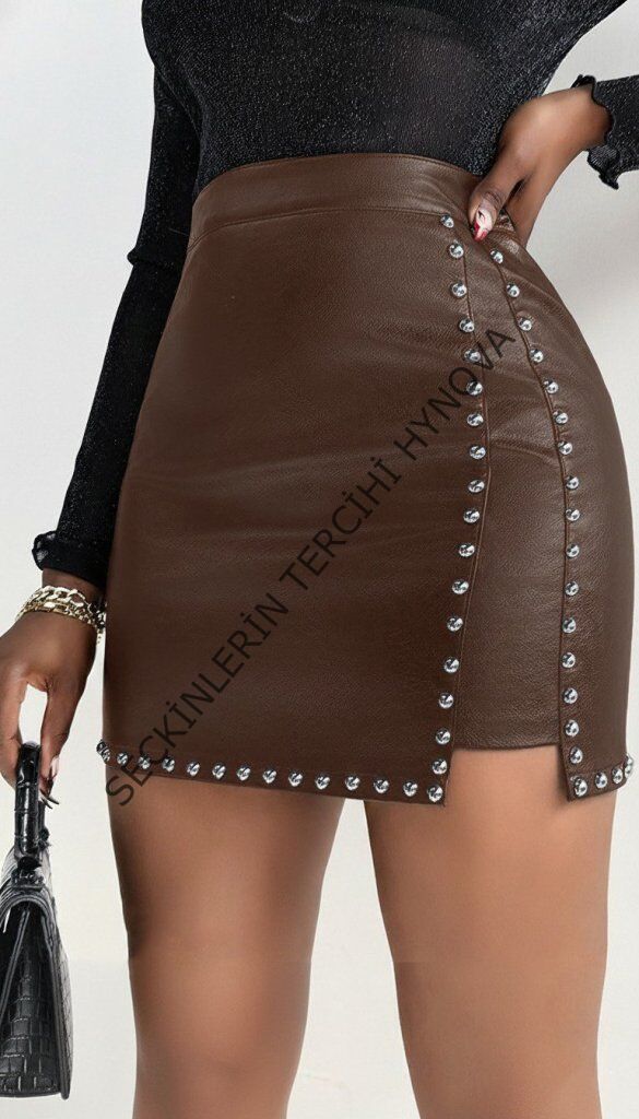 Kadın Yüksek Belli Yandan çivili Mini Deri Etek