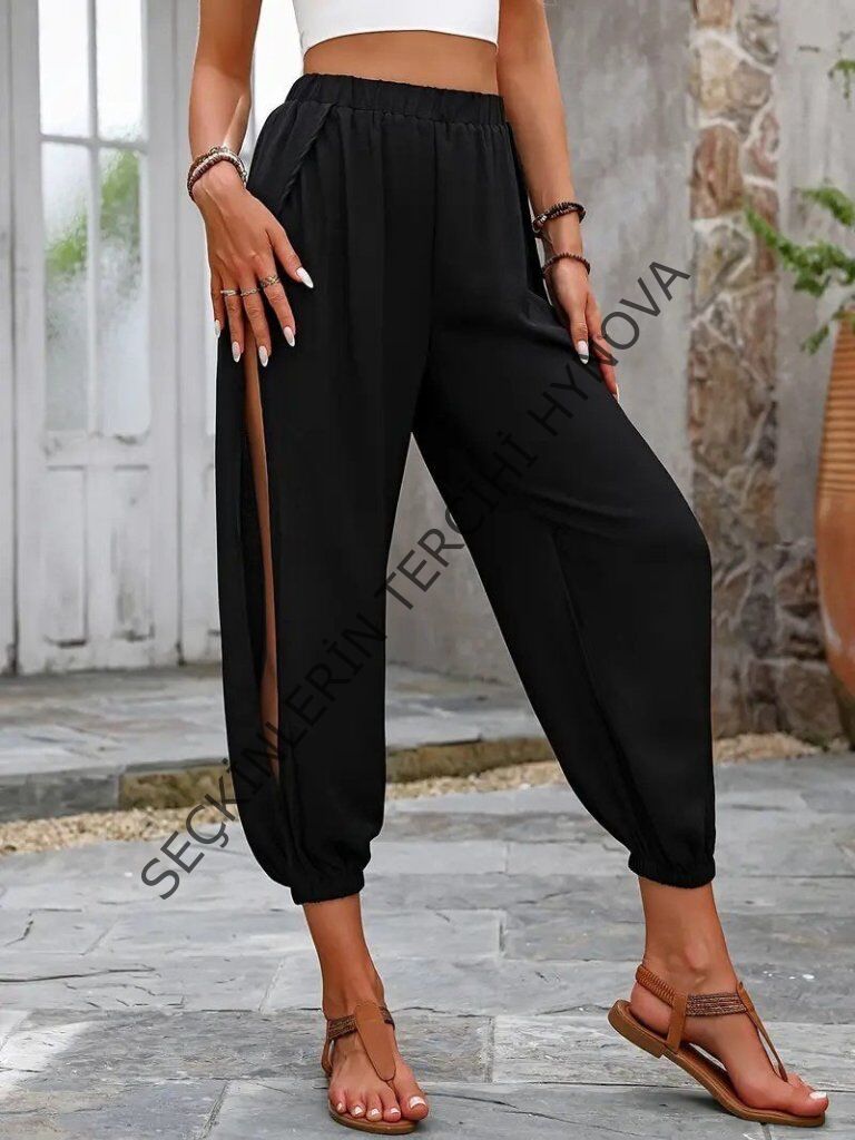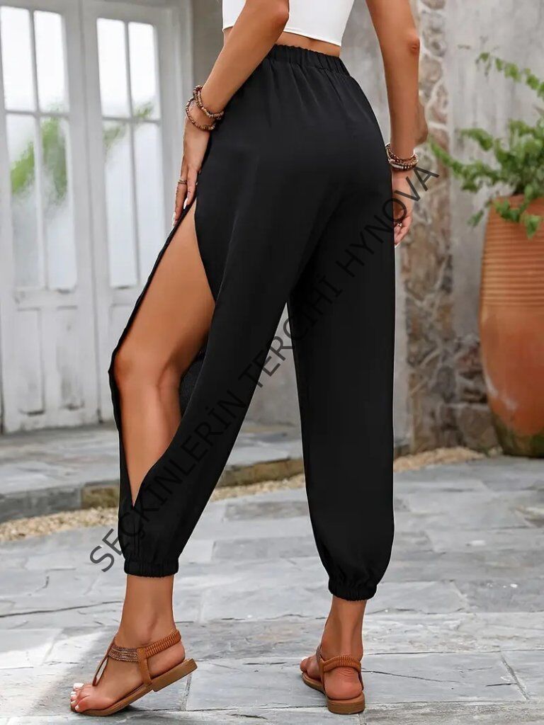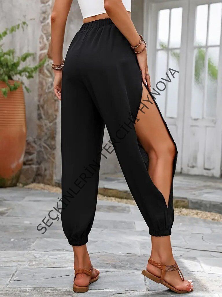 Kadın Yüksek Belli Yanlardan çapraz Detay Yırtmaçlı Viskon Pantolon
