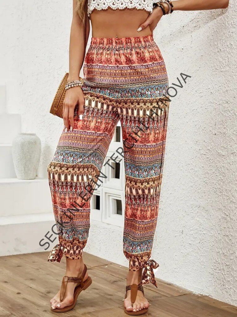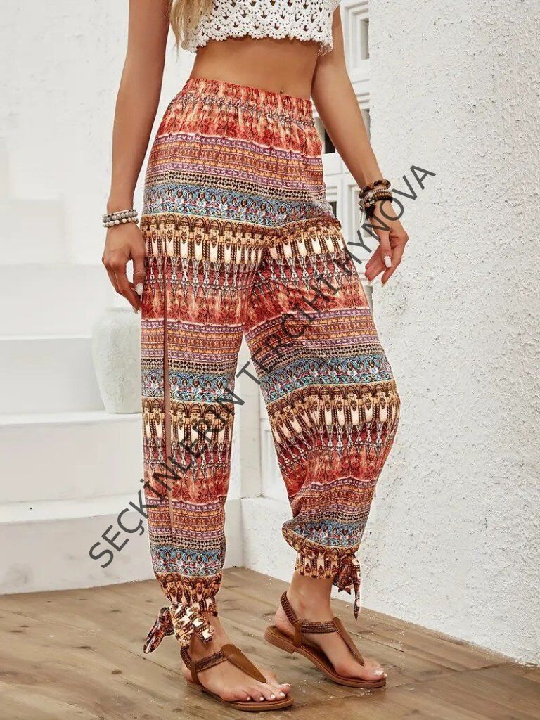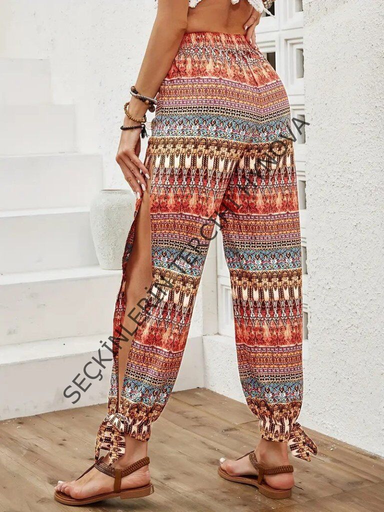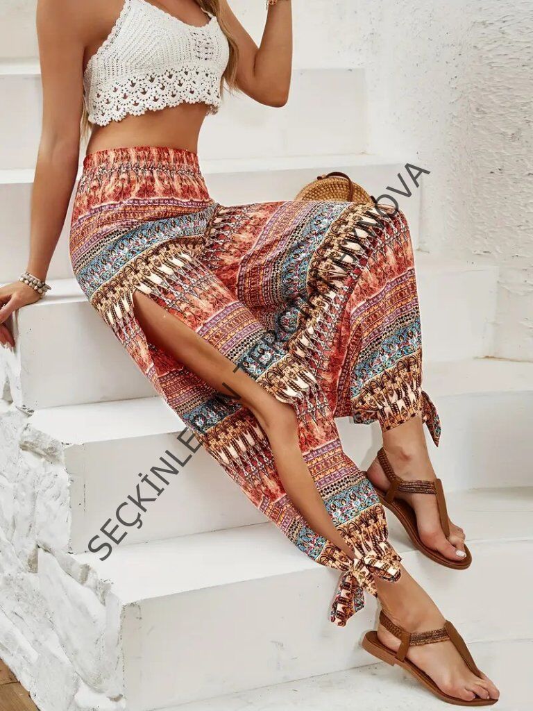 Kadın Yüksek Belli Yanlardan Yırtmaç Detaylı Desenli Bürümcük Pantolon
