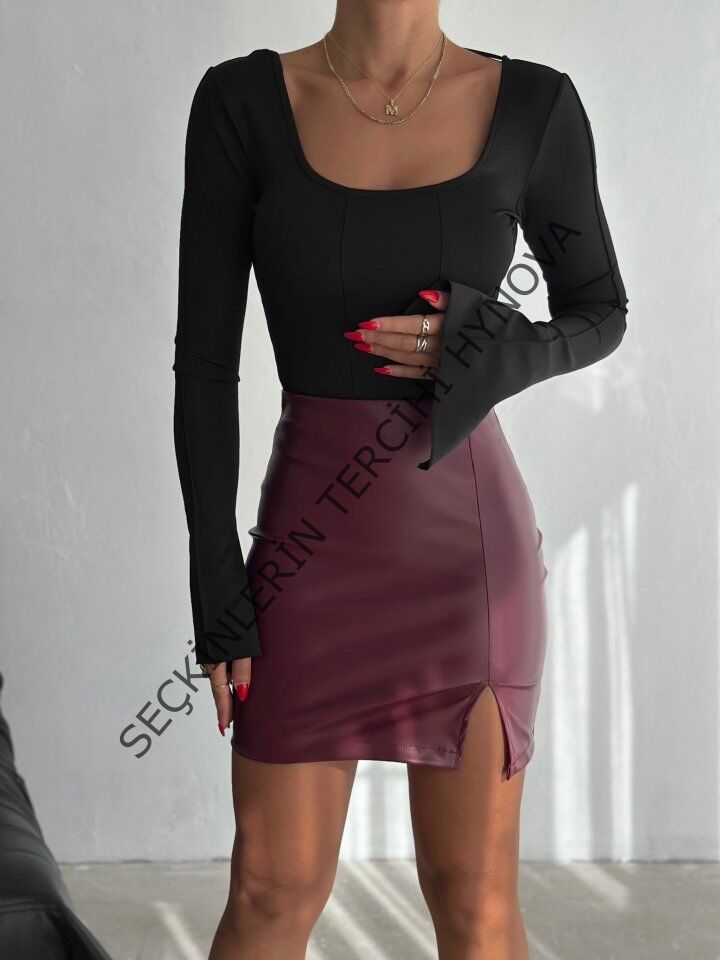 Kadın Yüksel Bel Yırtmaç Detay Mini Deri Etek