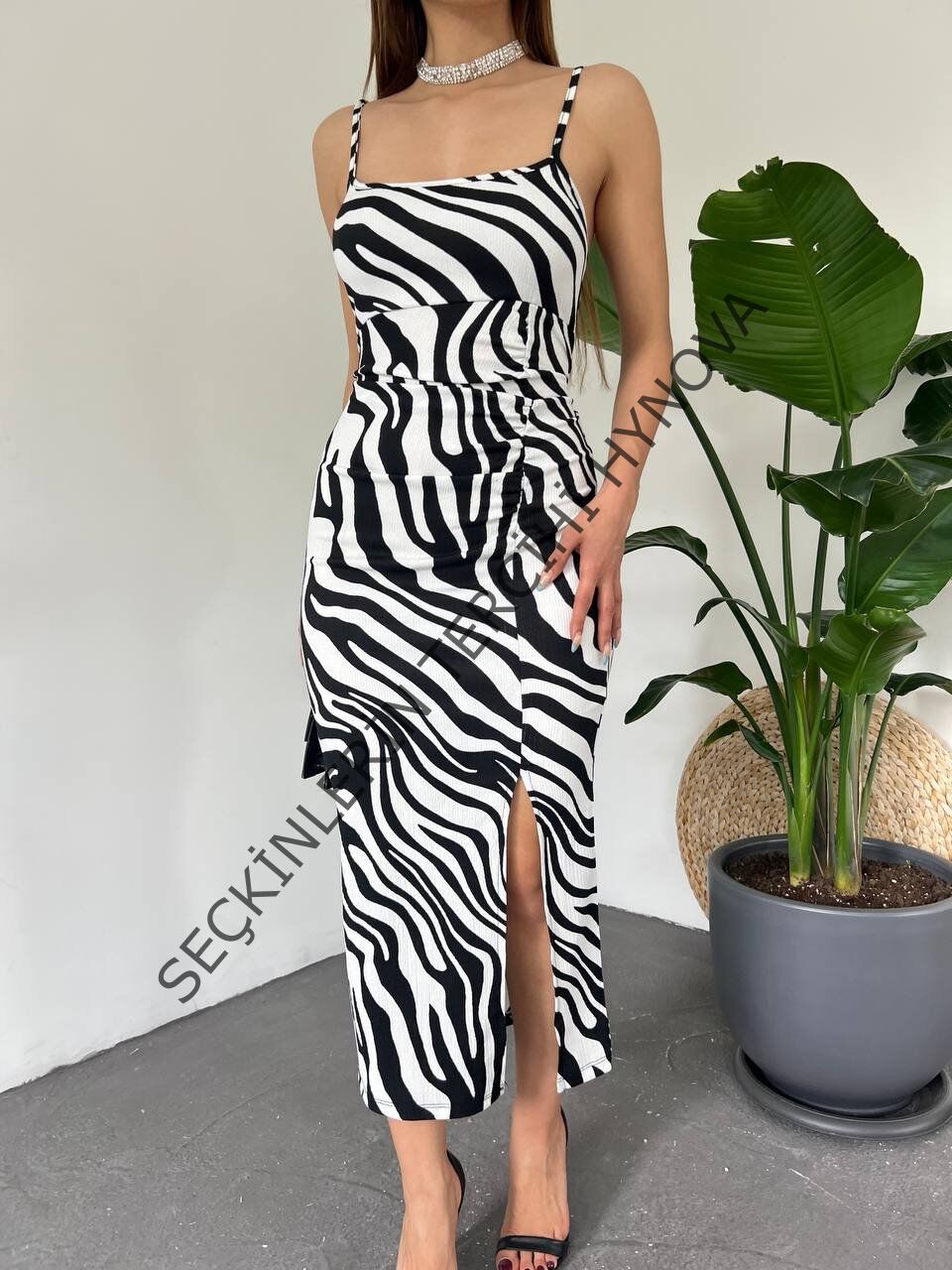 Kadın Zebra Baskılı Omuz Askılı Sırt Dekolteli Yırtmaç Detay Elbise
