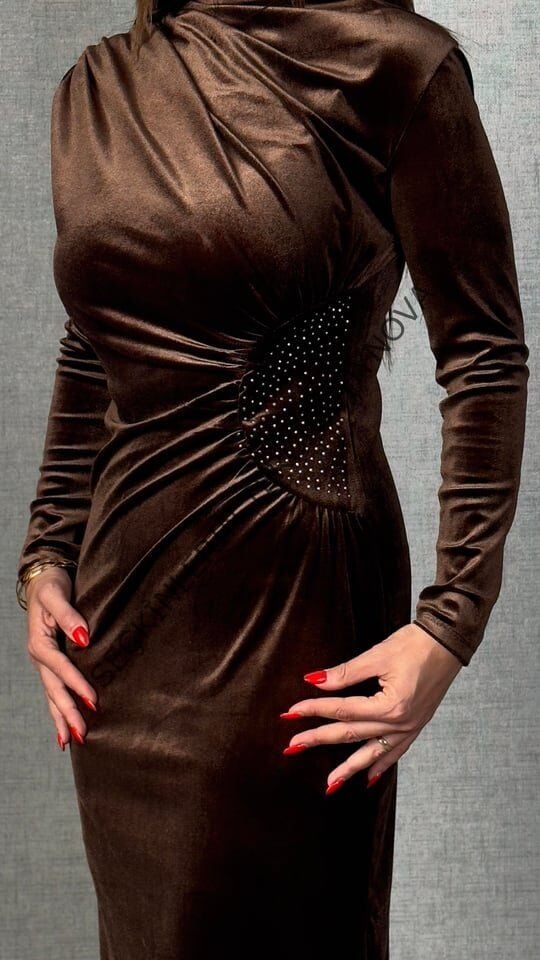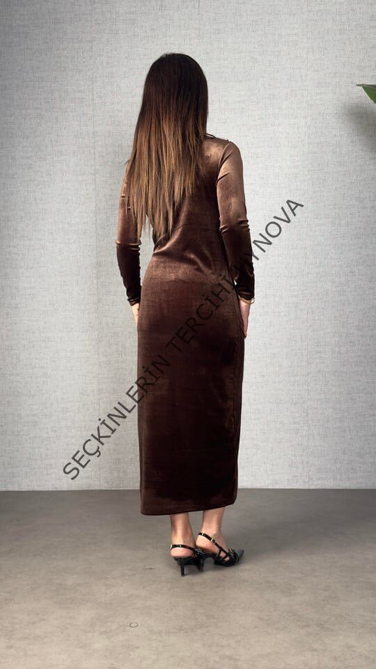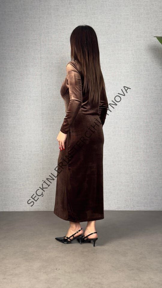 Kadınbalıkçı Yaka Büzgü Ve Taş Işleme Detay Maxi Boy Kadife Elbise