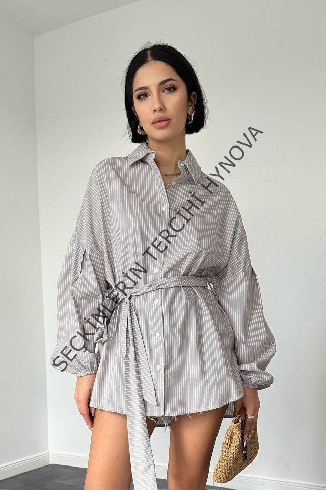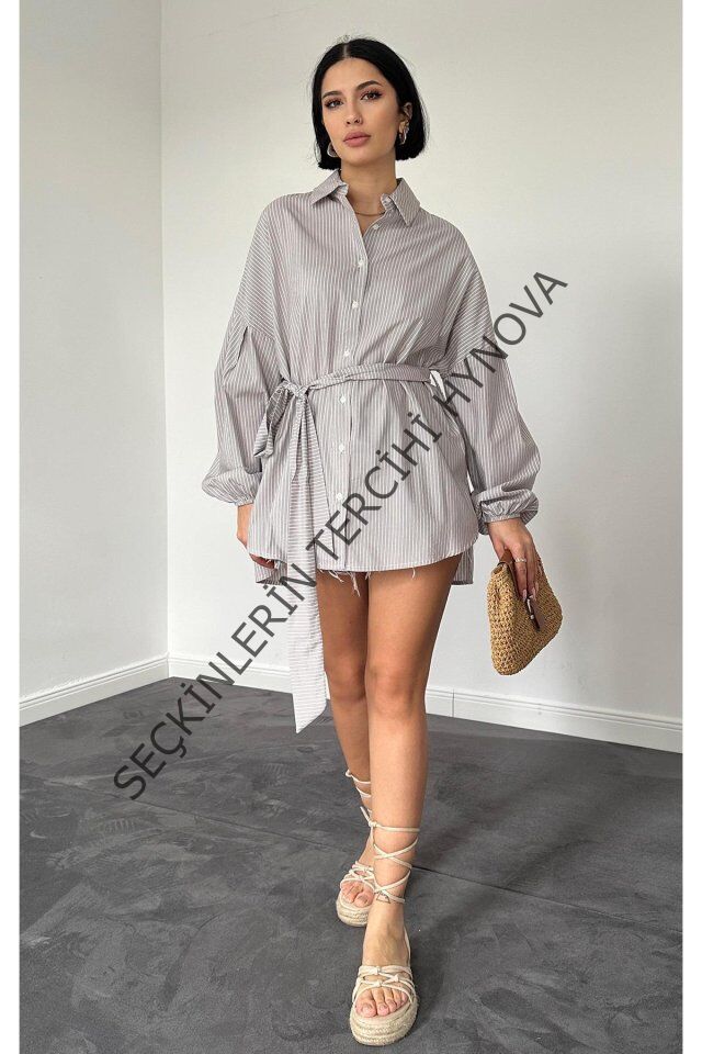 Kahverengi Çizgili Poplin Kuşaklı Gömlek