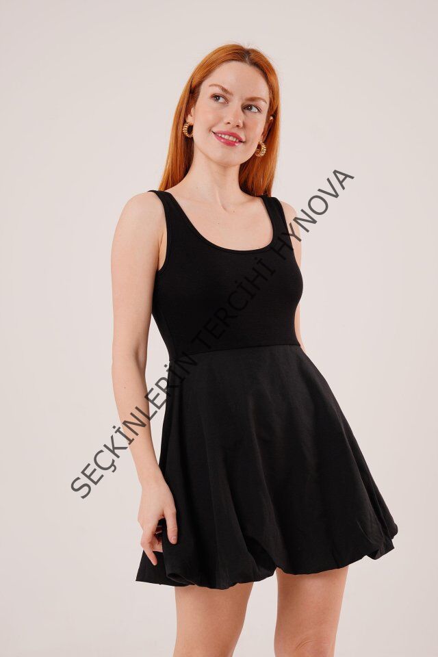 Kalın Askılı Balon Etek Siyah Mini Elbise