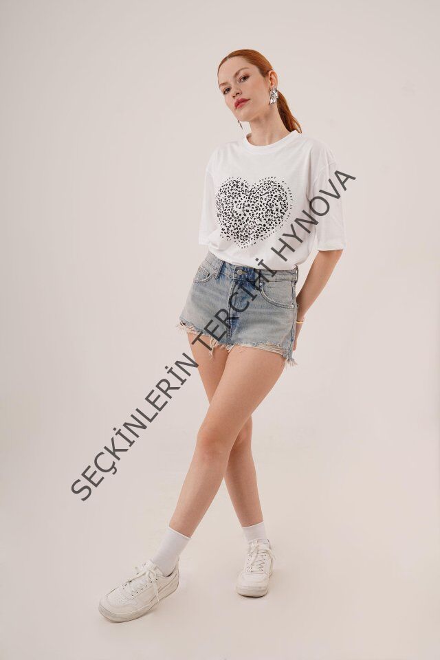 Kalp Baskılı Crop Beyaz Tişört