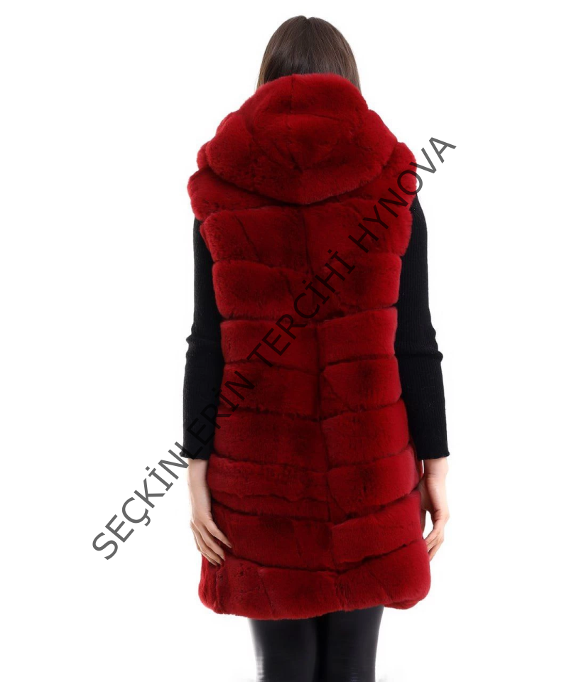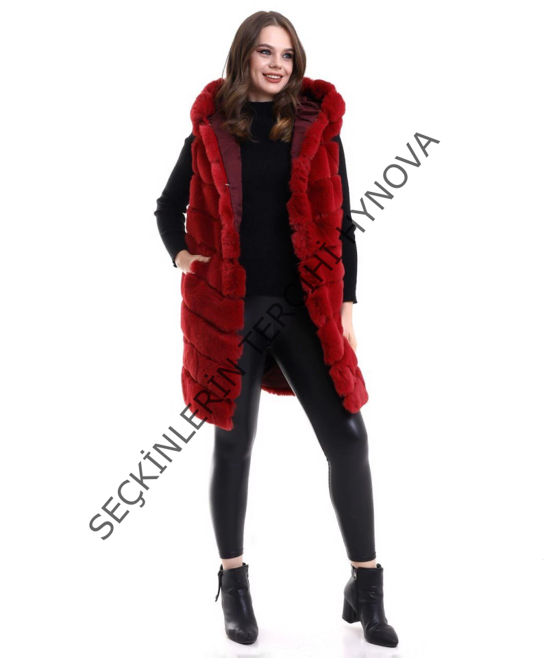 Kapşonlu Peluş Kürk Yelek Premium Kalite, Tam Astarlı, Uzun Model - Kırmızı