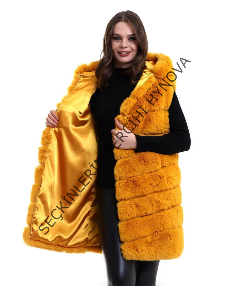 Kapşonlu Peluş Kürk Yelek Premium Kalite, Tam Astarlı, Uzun Model - Sarı