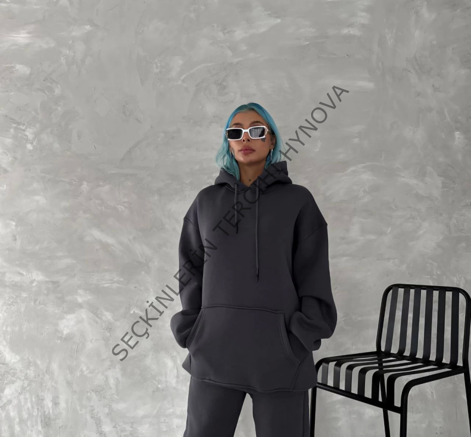 Kapşonlu Üç İplik Penye Basic SweatShirt - Füme
