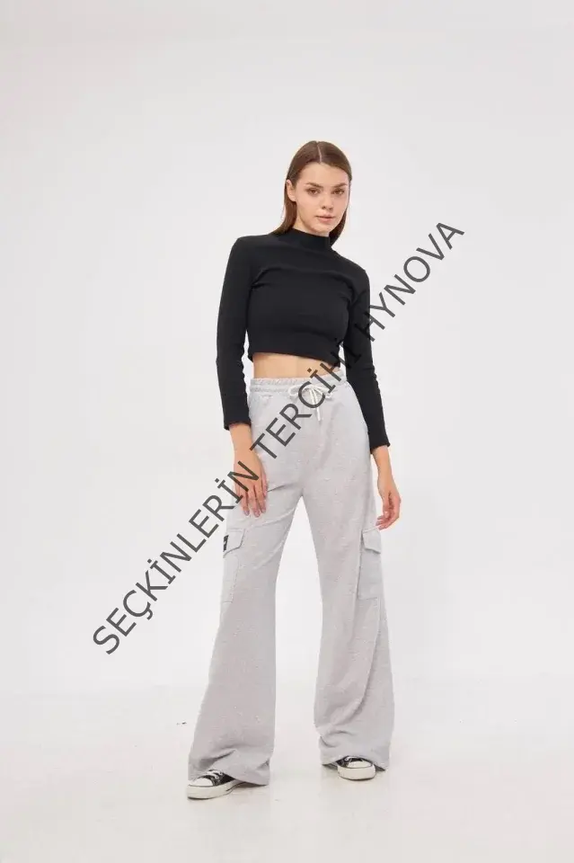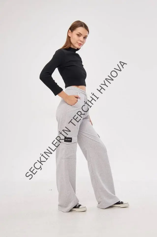 Kargo Cepli Palazzo Oversize Kesim İki Iplik Bol Paça Eşofman Altı Pantalon - Gri