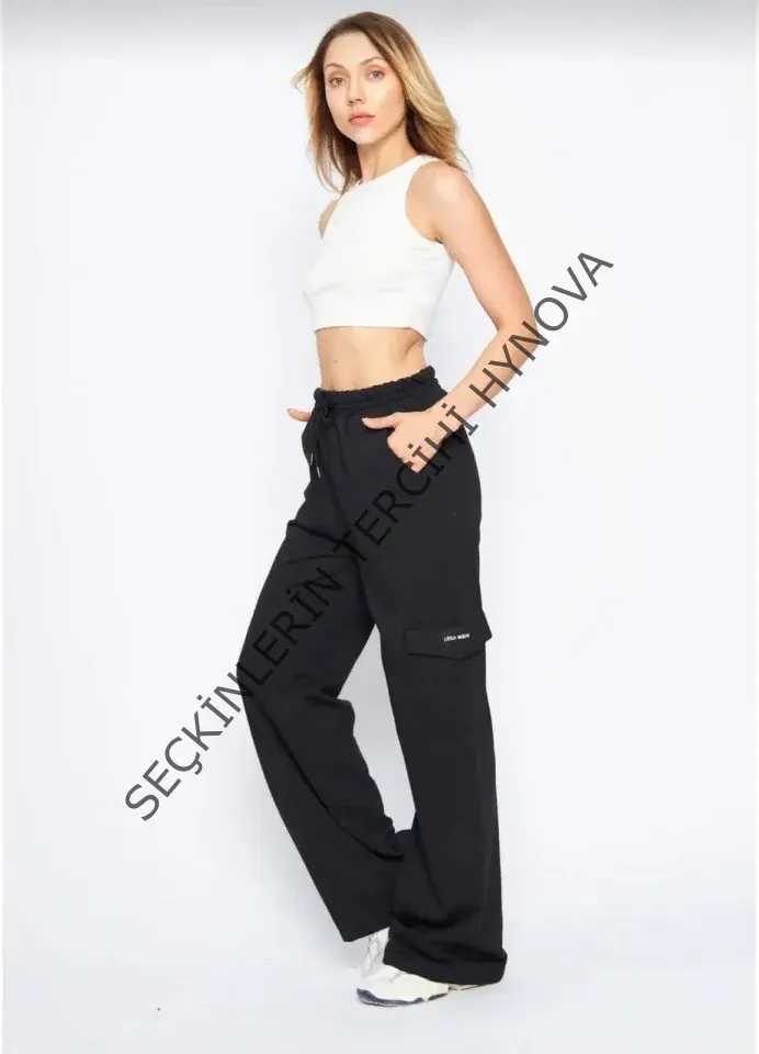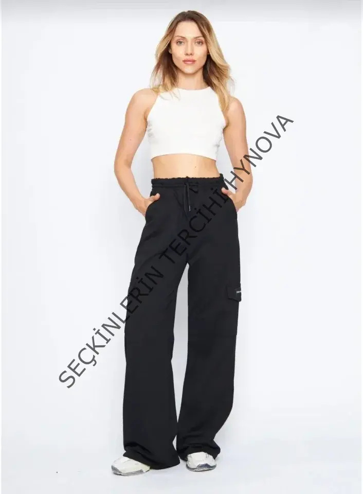 Kargo Cepli Palazzo Oversize Kesim İki Iplik Bol Paça Eşofman Altı Pantalon - Siyah