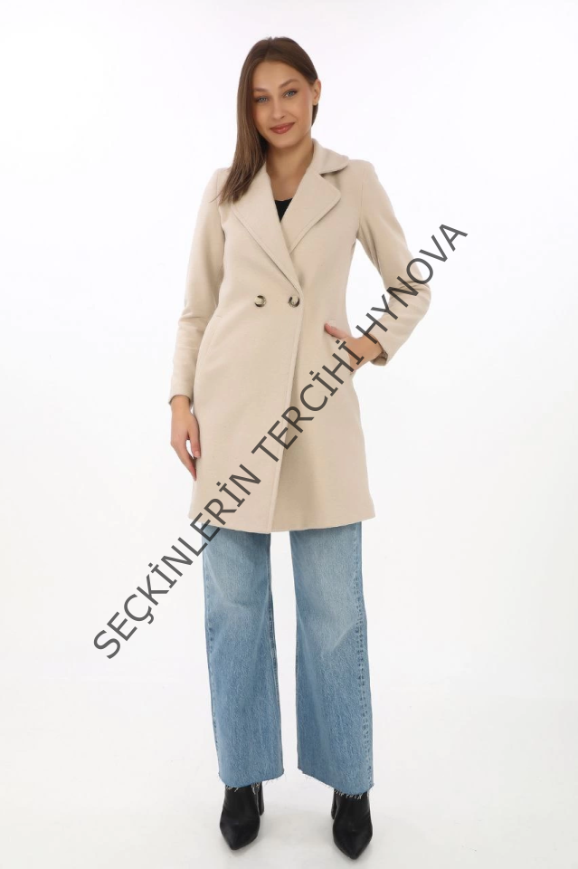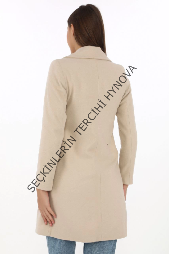 Kaşe Kaban – Siyah Yünlü Dokuma, Kruvaze Yaka, Astarlı, Cepli, Kuşaklı Uzun Boy Tesettür Uyumlu Kışlık Şık Kaban - Bej