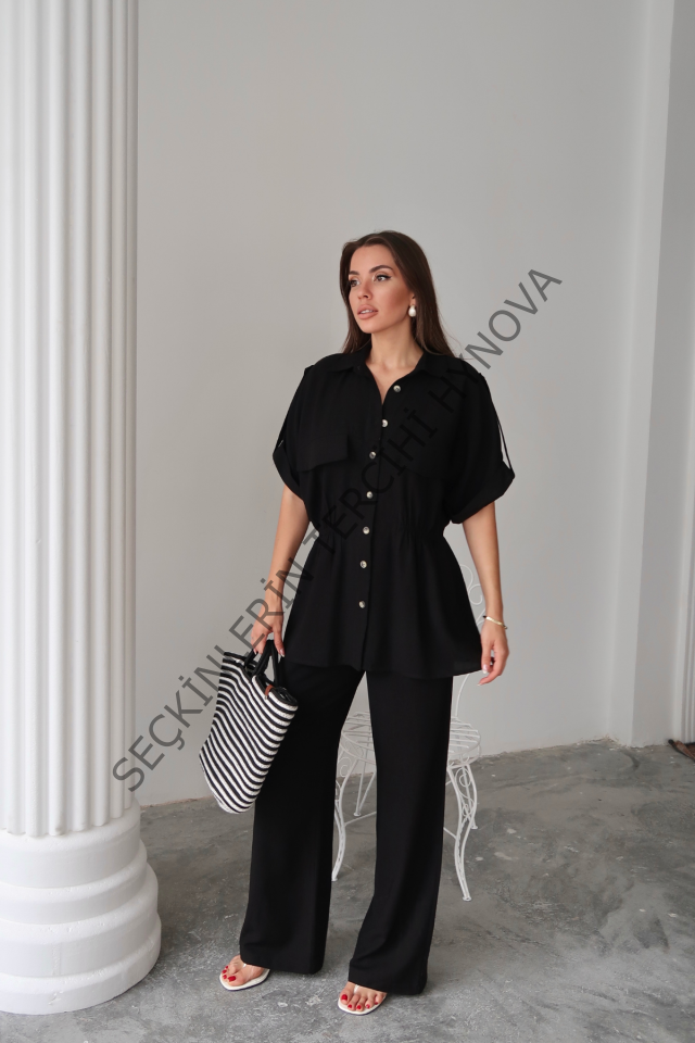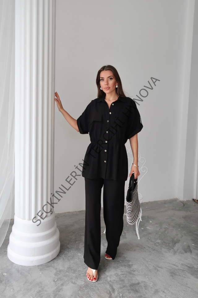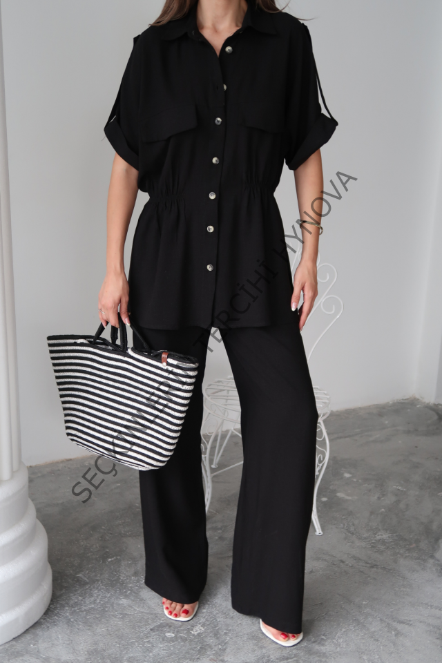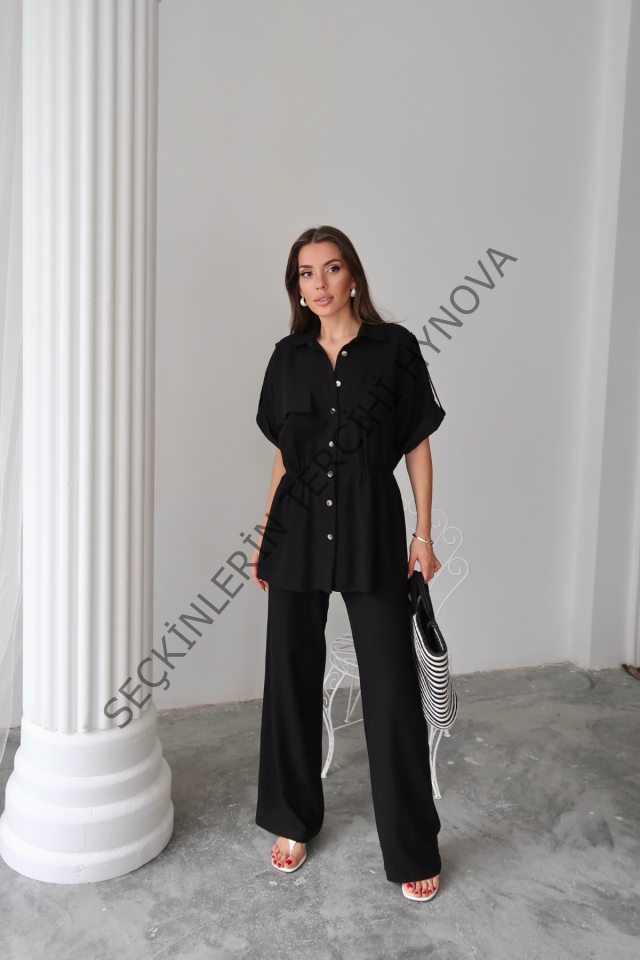 KETEN BELDEN BÜZGÜ DETAYLI GÖMLEK - PANTOLON TAKIM - Siyah