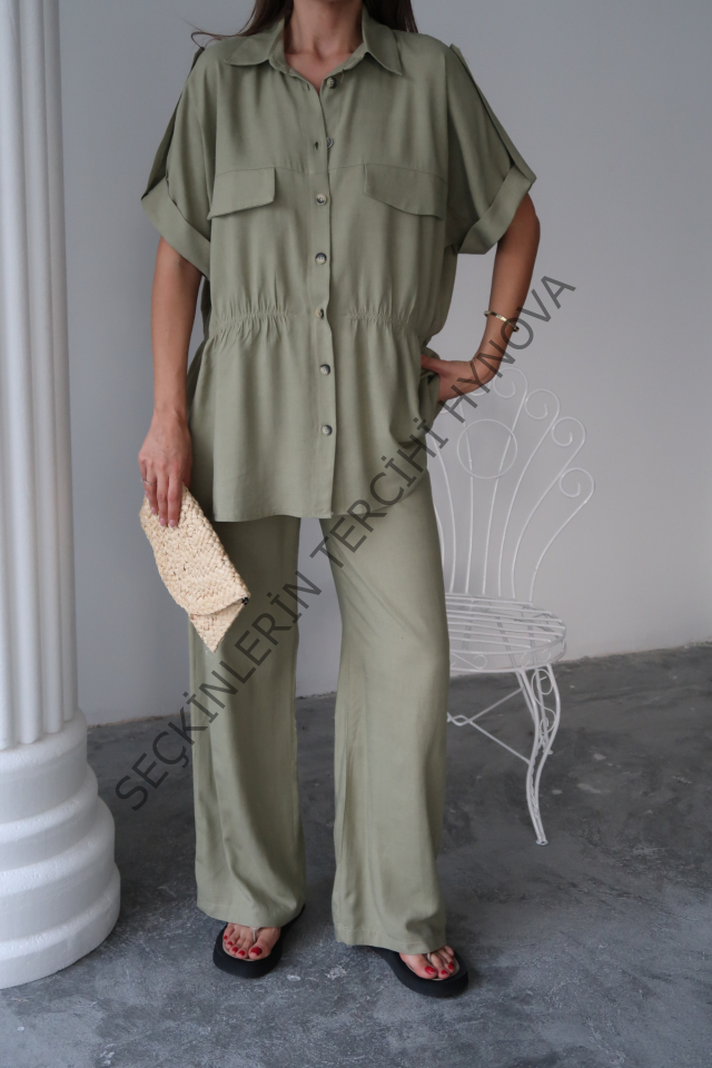 KETEN BELDEN BÜZGÜ DETAYLI GÖMLEK - PANTOLON TAKIM - Yeşil