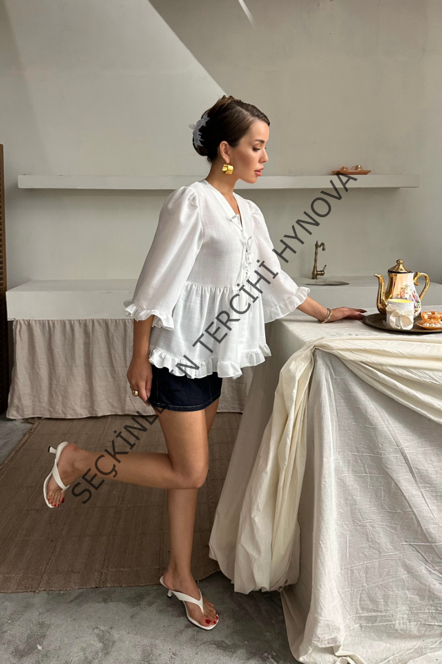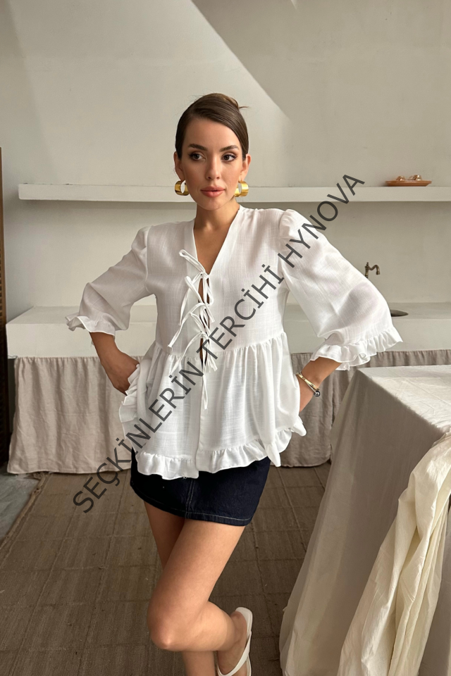 KETEN BLUZ ÖNDEN BAĞLAMALI FIRFIR DETAYLI - Beyaz