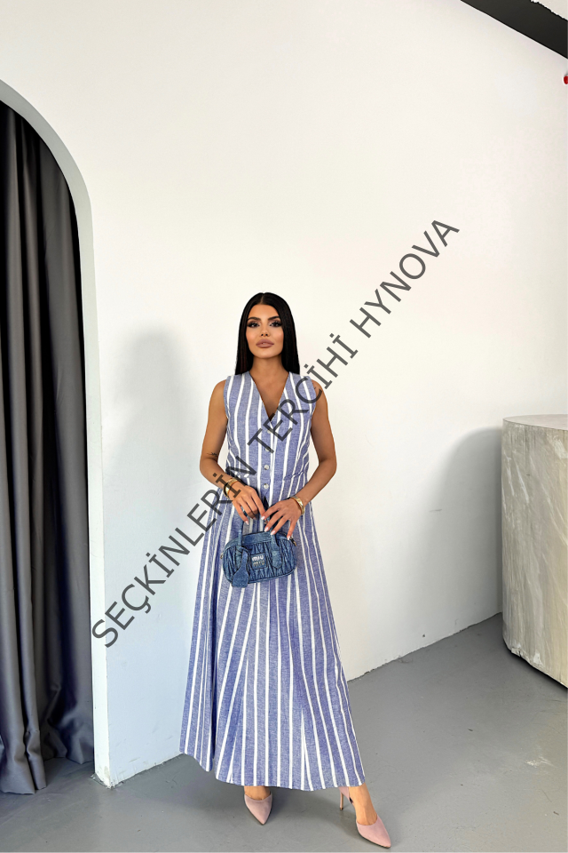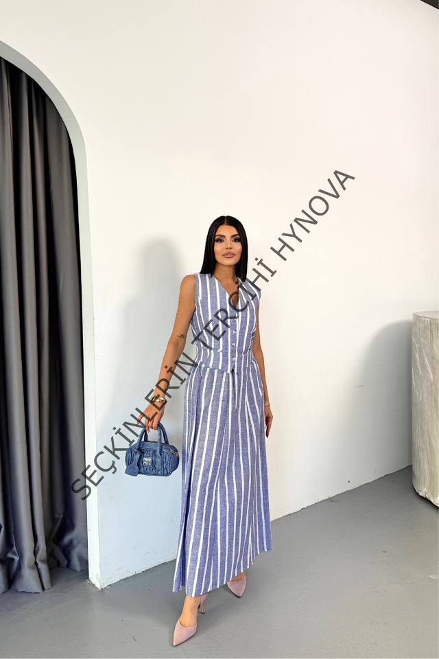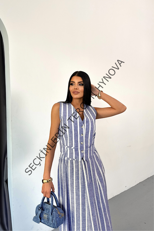 KETEN ÇİZGİLİ YELEK - UZUN ETEK TAKIM - Mavi