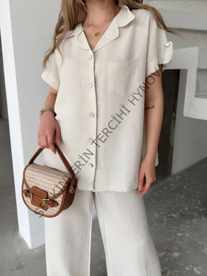 Keten Kısa Kollu Cepli Gömlek Pantolon Ikili Takım - Beyaz