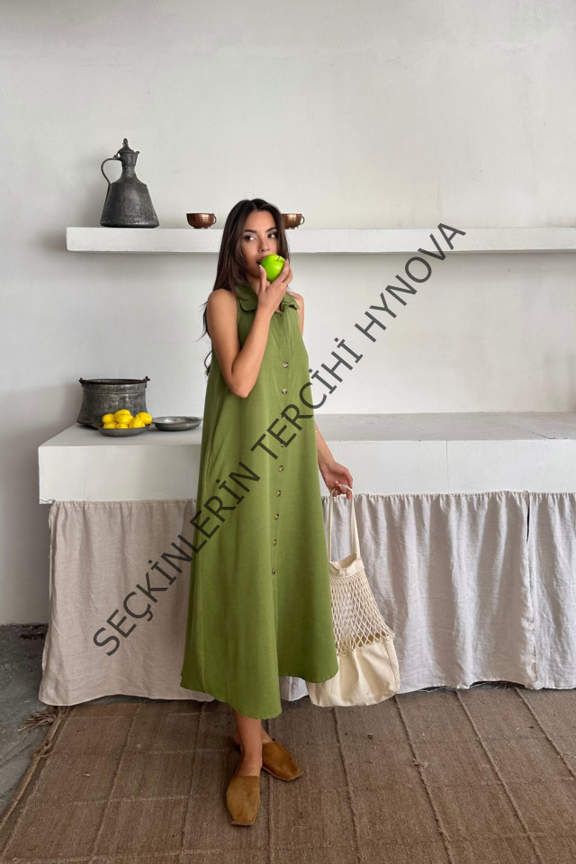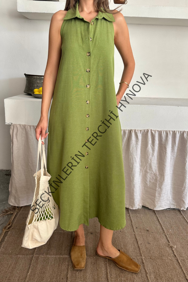 KETEN ÖNDEN DÜĞMELİ KOLSUZ GÖMLEK YAKA ELBİSE - Yağ Yeşili