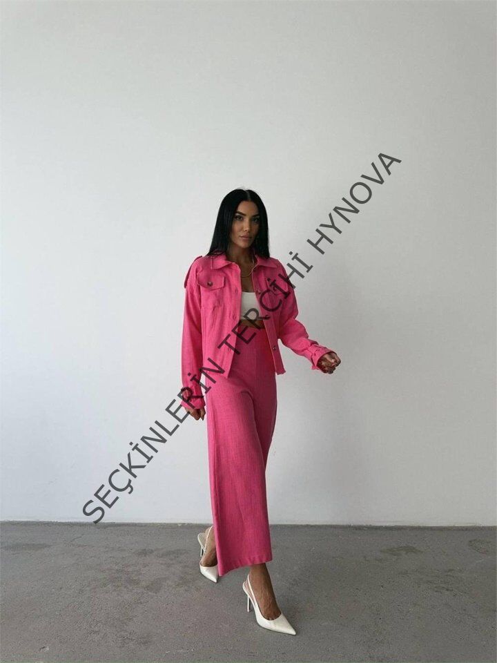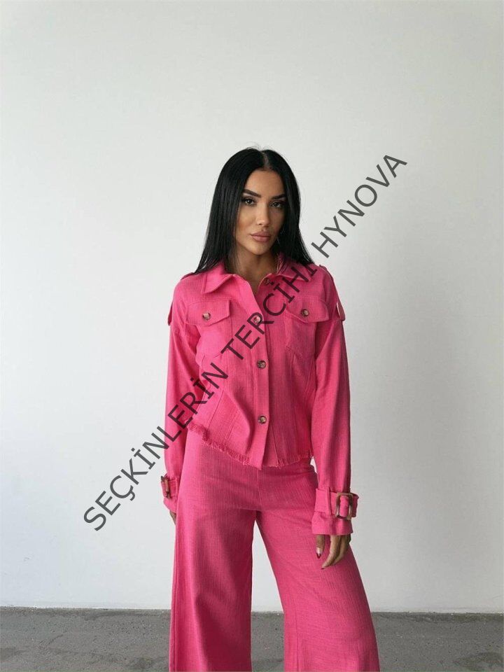 KETEN PÜSKÜL DETAYLI GÖMLEK-PANTOLON TAKIM - Fuşya
