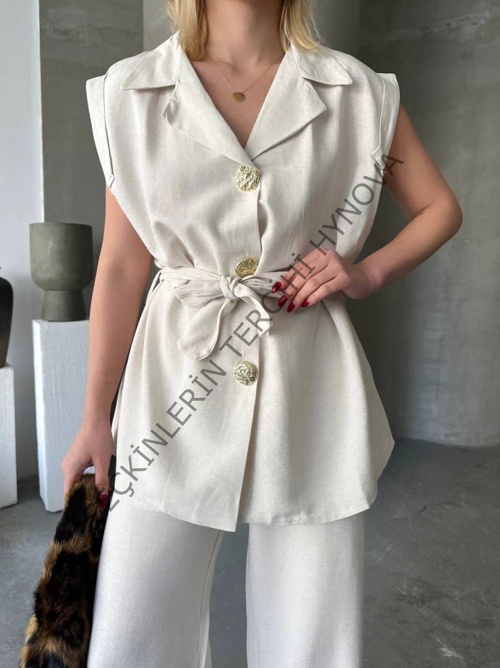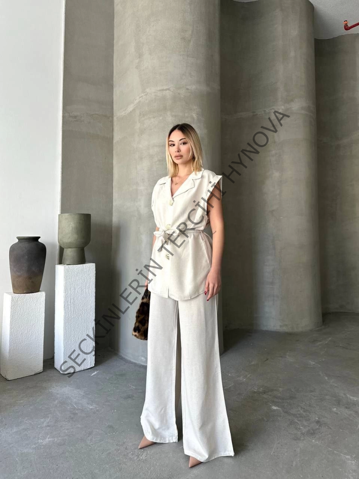 Keten Sıfır Kol Kuşaklı Ceket Pantolon Ikili Takım - Beyaz