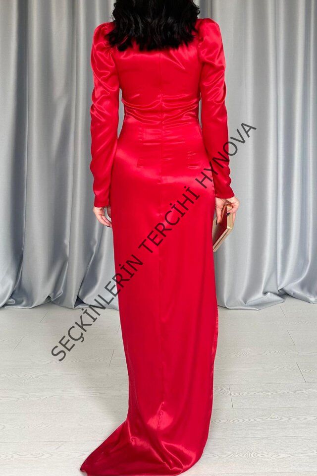 Kırmızı Göğsü Kuplu Yırtmaçlı Elbise