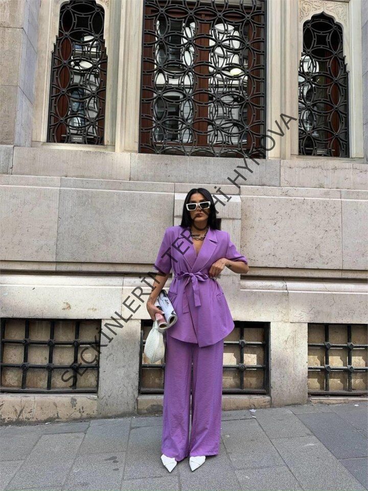 KISA KOL BAĞLAMA DETAYLI CEKET-PANTOLON TAKIM - Mor