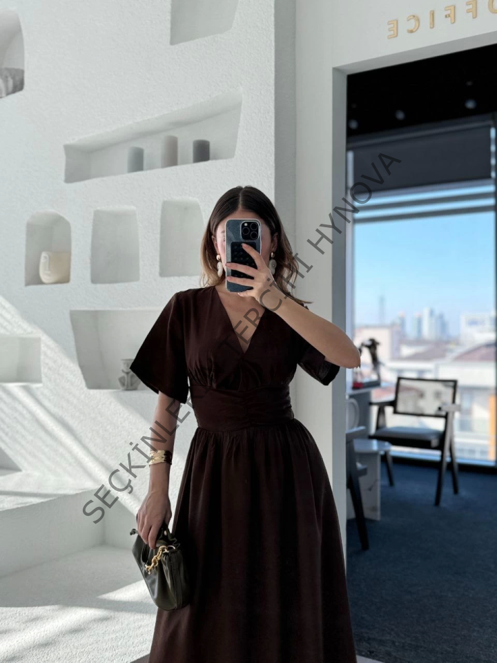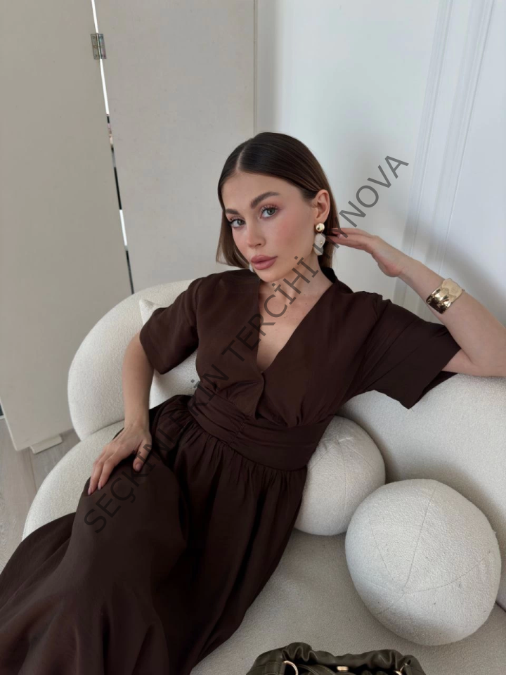 Kısa Kollu Uzun Elbise - Kahve