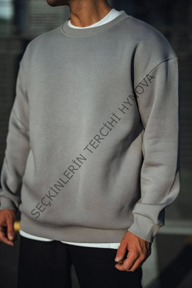 Kışlık Bisiklet Yaka Üç İplik Basic SweatShirt - Boyalı Gri