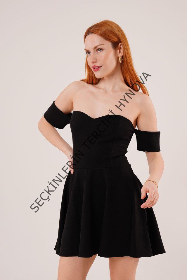 Kol Detaylı Straplez Siyah Mini Elbise