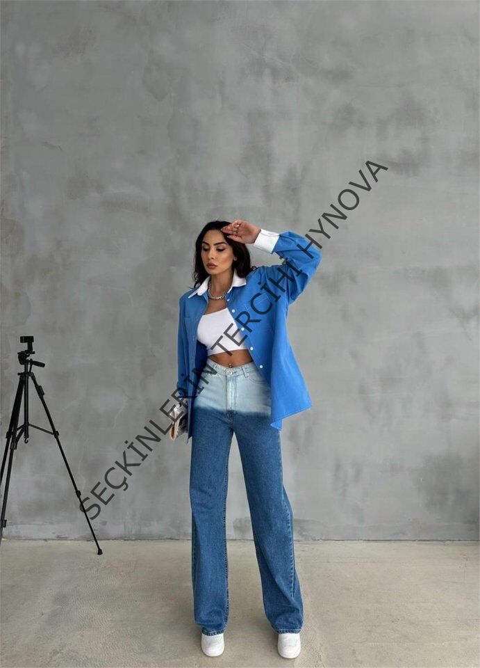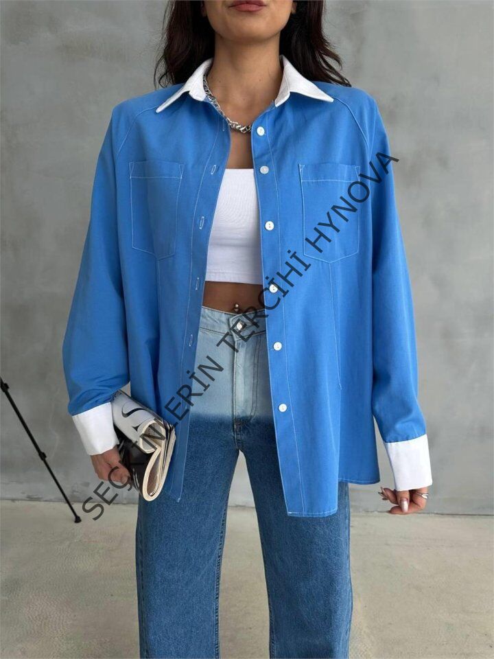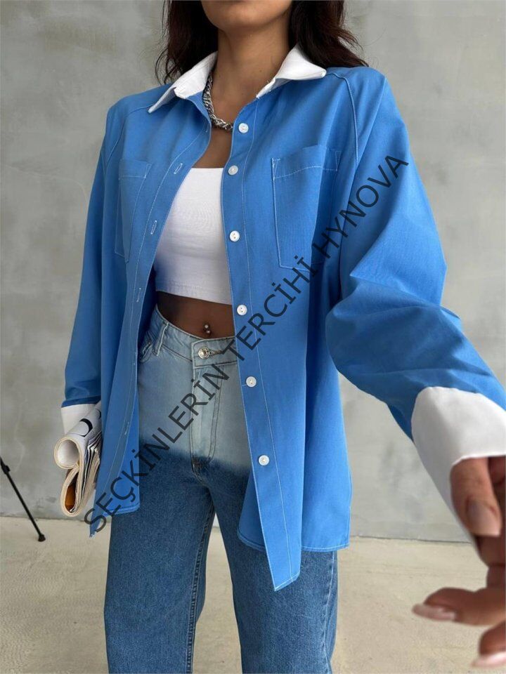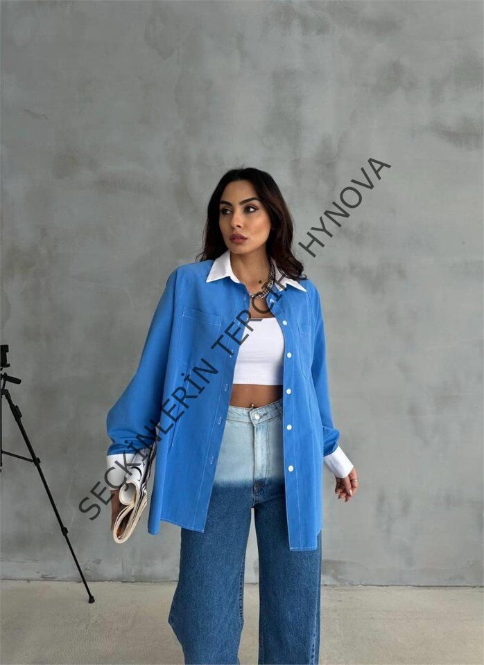 KOL VE MANŞET BEYAZ KAPALI PİLE DETAYLI GÖMLEK - Mavi