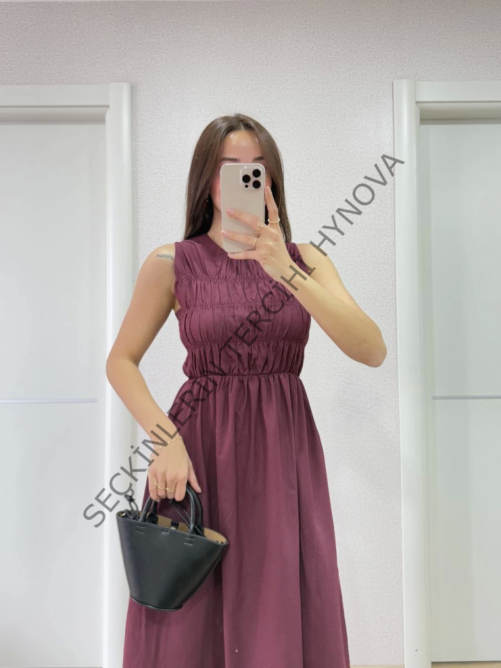 Kolsuz Göğüs Lastıklı Uzun Elbise - Bordo