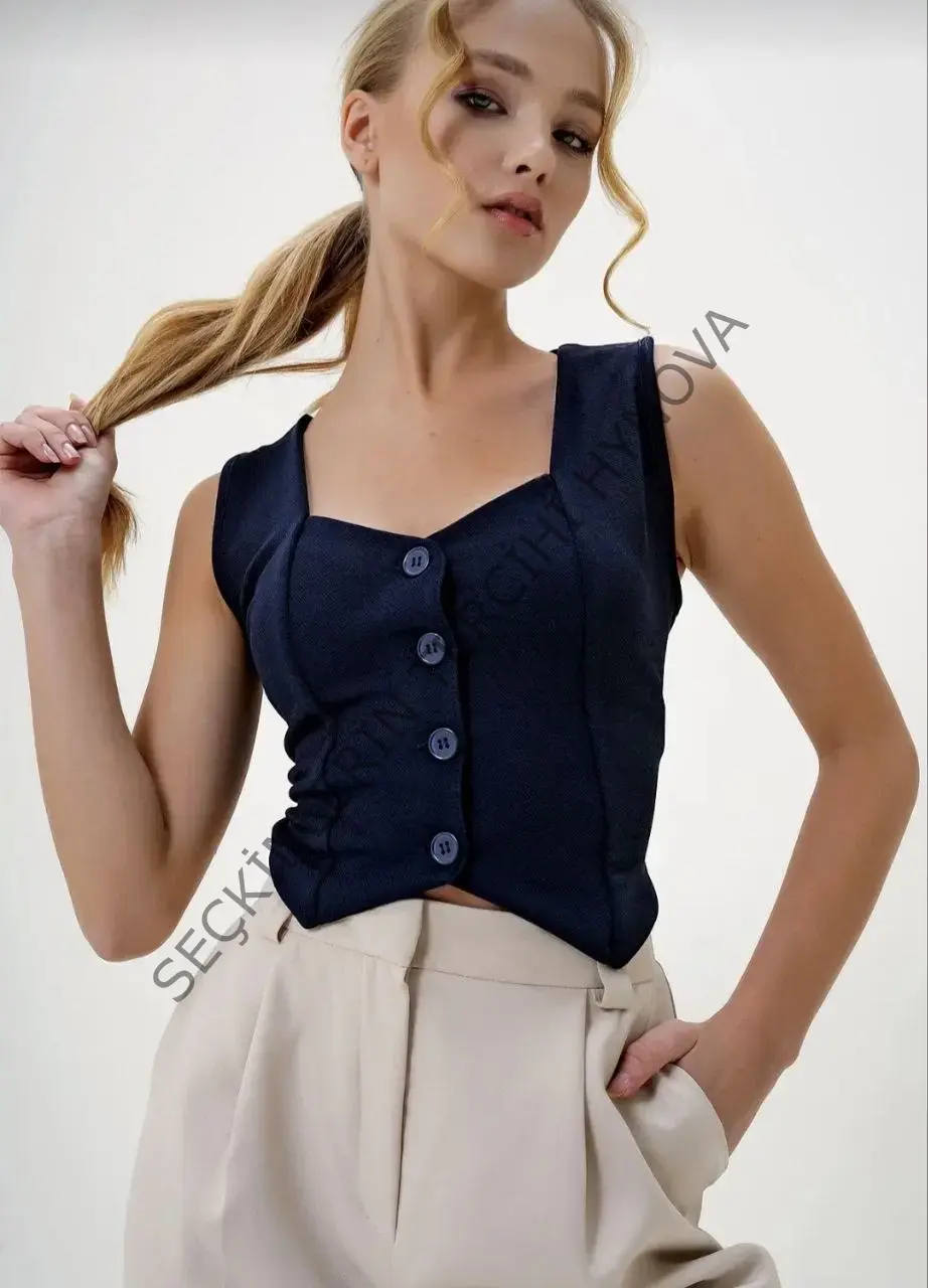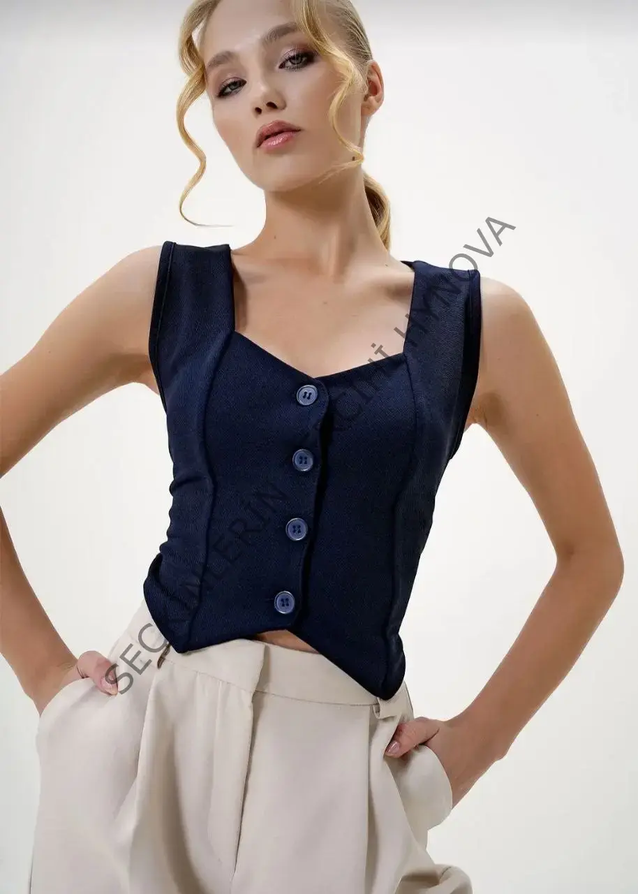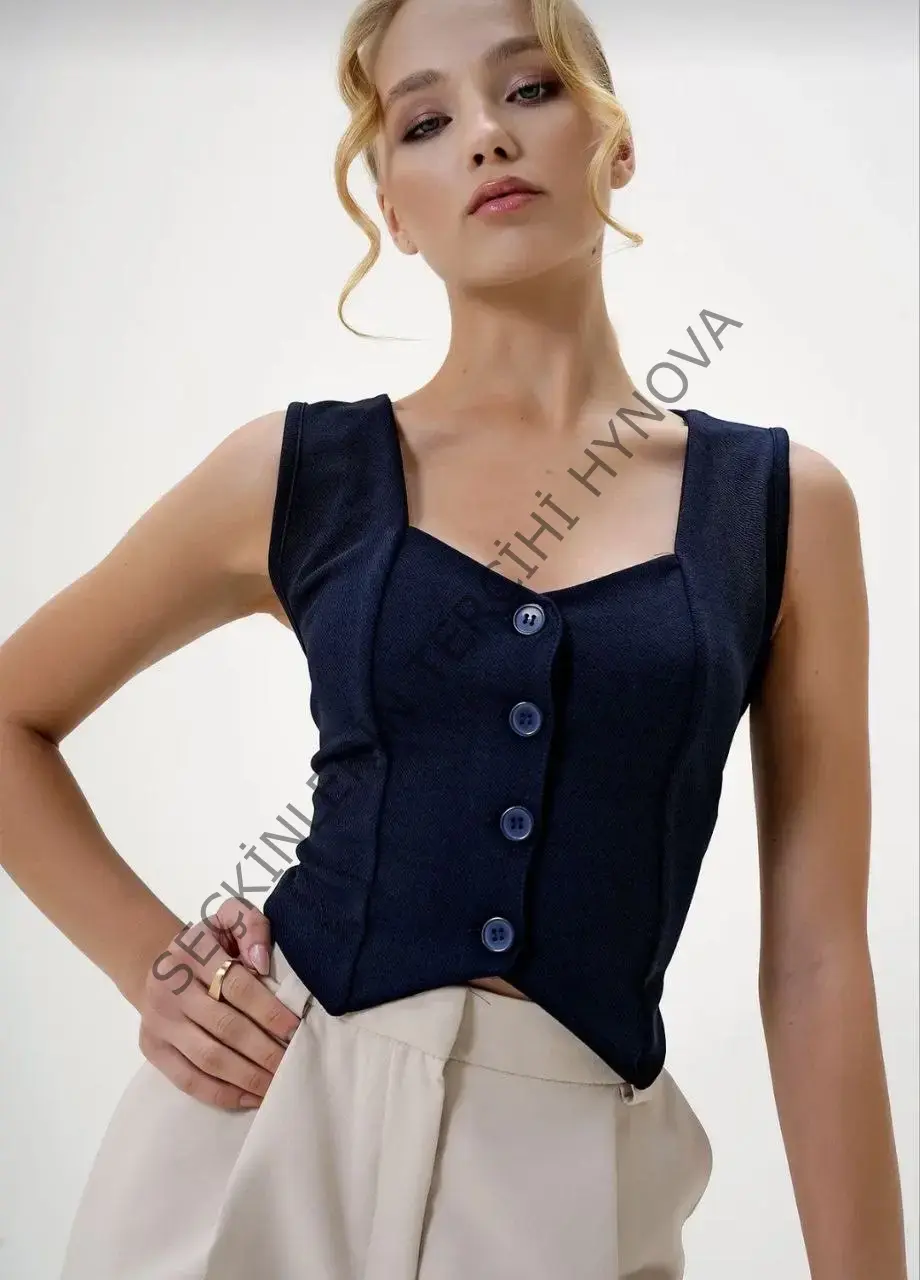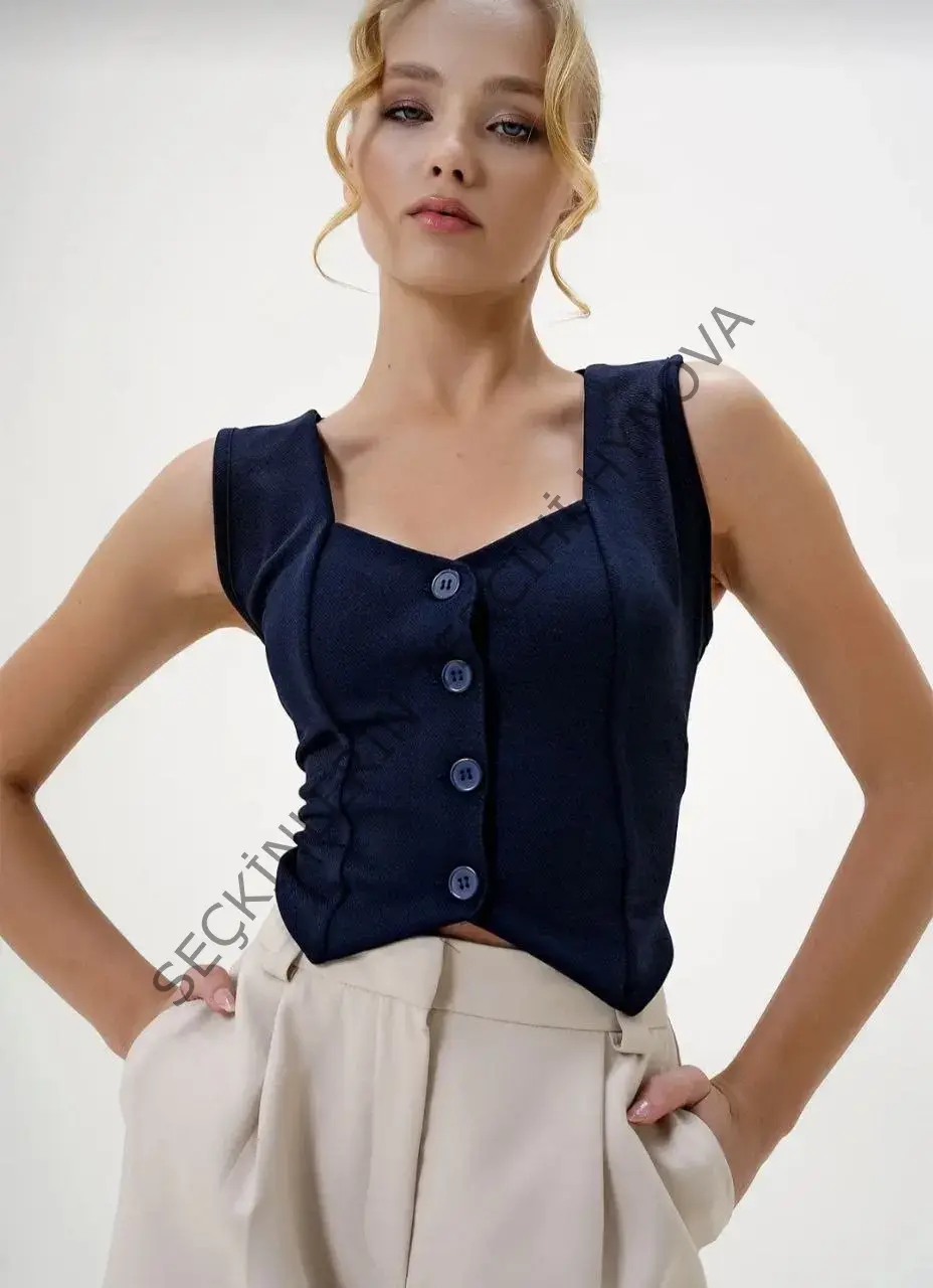 Krep kumaş düğmeli yelek lacivert s3395