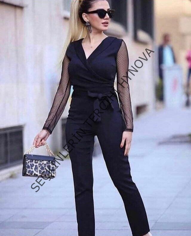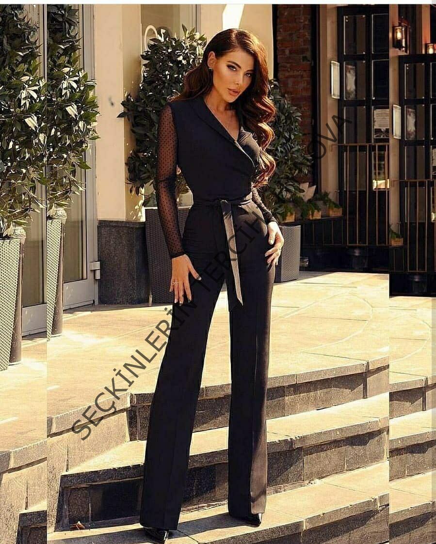Krep Kumaş Kol Tül Puan Detaylı Kuşaklı Tulum 141 Cm