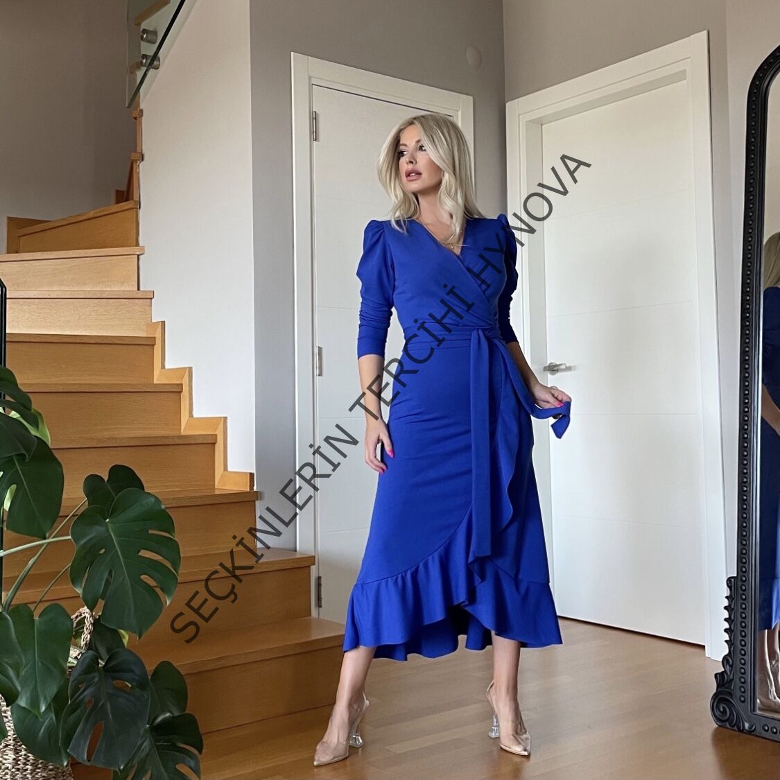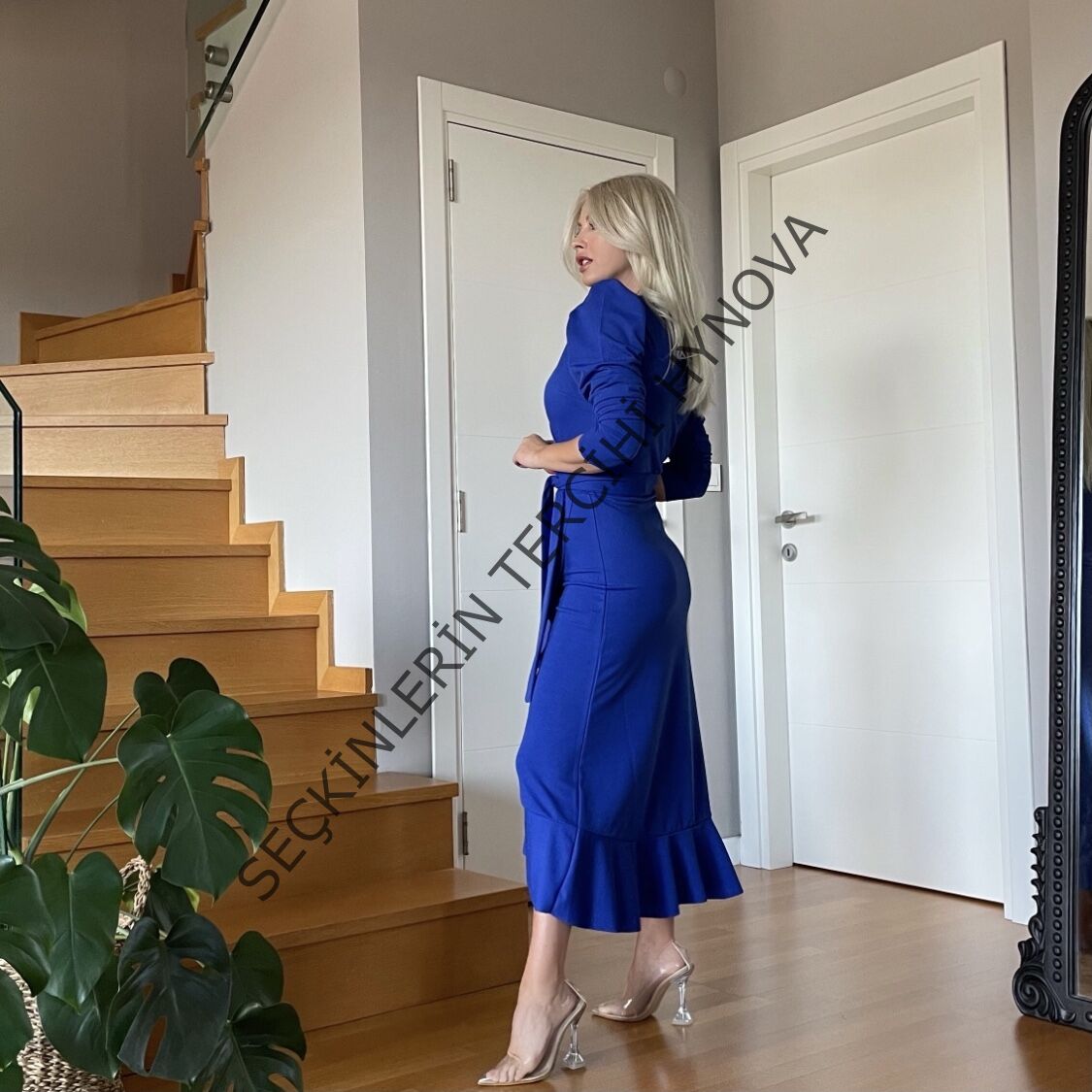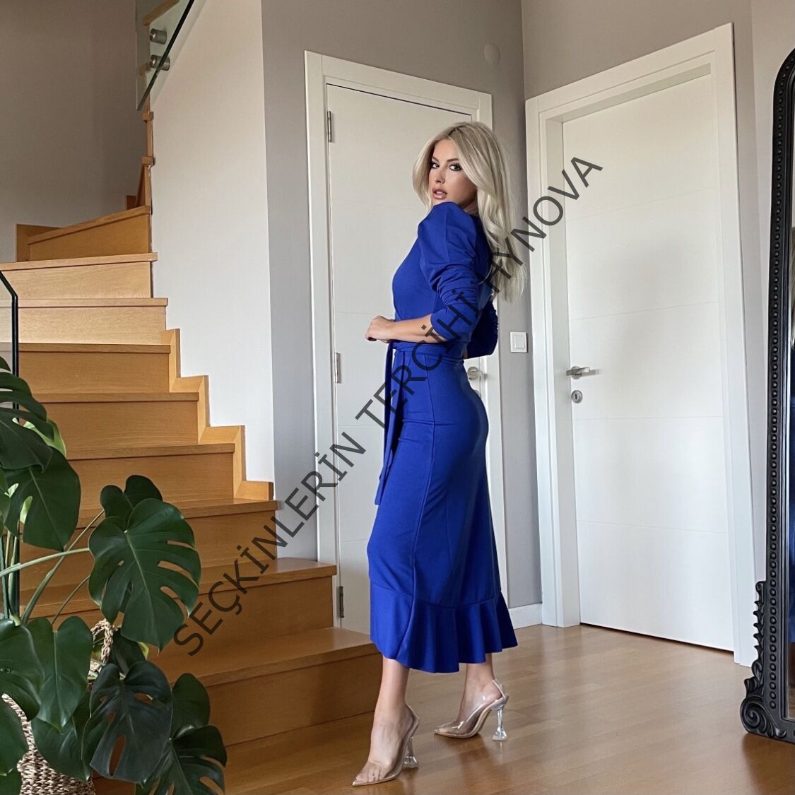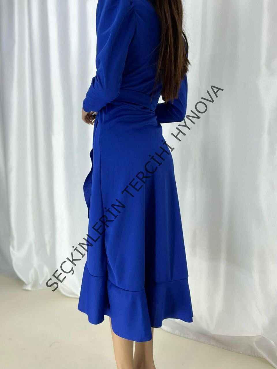 Krep Kumaş Midi Boy Kuşaklı Uzunkol Elbise