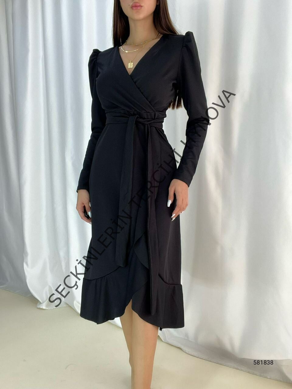 Krep Kumaş Midi Boy Kuşaklı Uzunkol Elbise 113 Cm